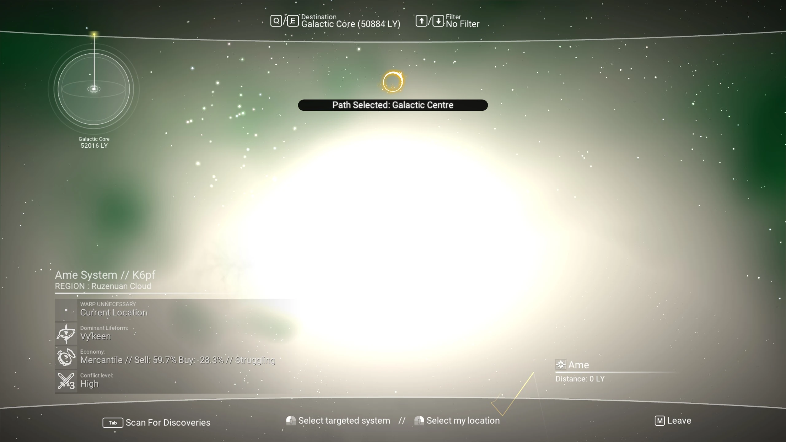 Um ein System in der Nähe des Zentrums zu erreichen, braucht man nur die erste Glyphe, was jedoch zu einem Teleport mit Annäherungsfehler führt. Man landet dann in einem von mehreren zufälligen Systemen in der Nähe mit einer verbleibenden Sprungdistanz von etwa 2000 Lj. Um das Zentrum direkt zu erreichen, benötigt man mindestens die 6. Glyphe, das Blütenblatt.