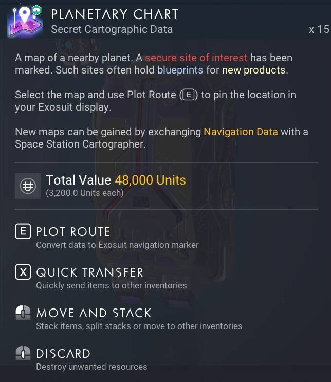 Er bietet Planetenkarten im Austausch gegen Navigationsdaten oder einen Kauf für 15 Naniten. Diese Karten ersetzen die Funktion "Nahe Strukturen orten" eines Signalboosters.