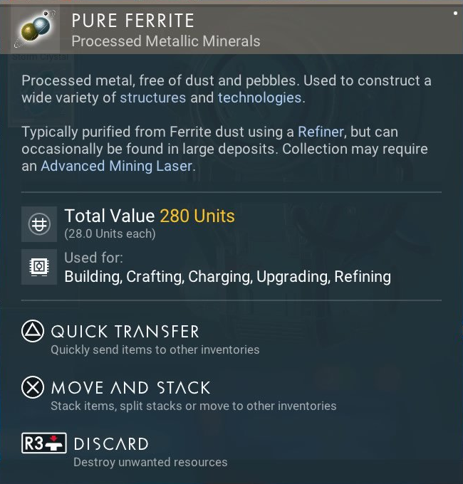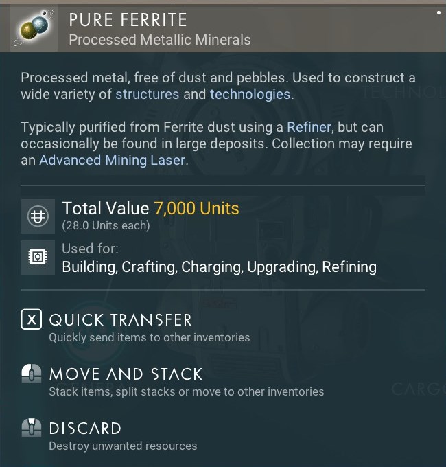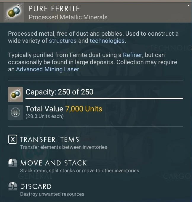 Wird üblicherweise mit einer Raffinerie aus gereinigtem Ferritstaub gewonnen und kann gelegentlich in großen Einlagerungen gefunden werden. Die Sammlung könnte einen fortgeschrittenen Minenlaser erfordern.