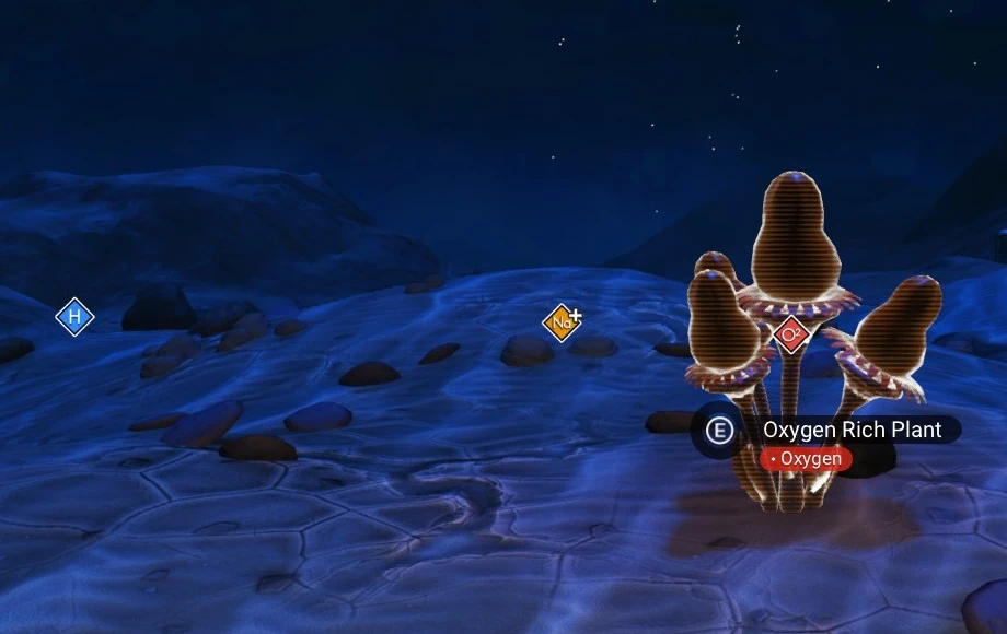 - Glücklicherweise ist Sauerstoff relativ häufig. Wenn man sich auf einem Planeten befindet, findet man überall auf der Oberfläche rote, sauerstoffreiche Pflanzen, die man direkt einsammeln kann. Sauerstoff kann auch manchmal gesammelt werden, wenn man verschiedene Pflanzen mit dem Minenstrahl abbaut, wie die meisten gefährlichen Pflanzen.