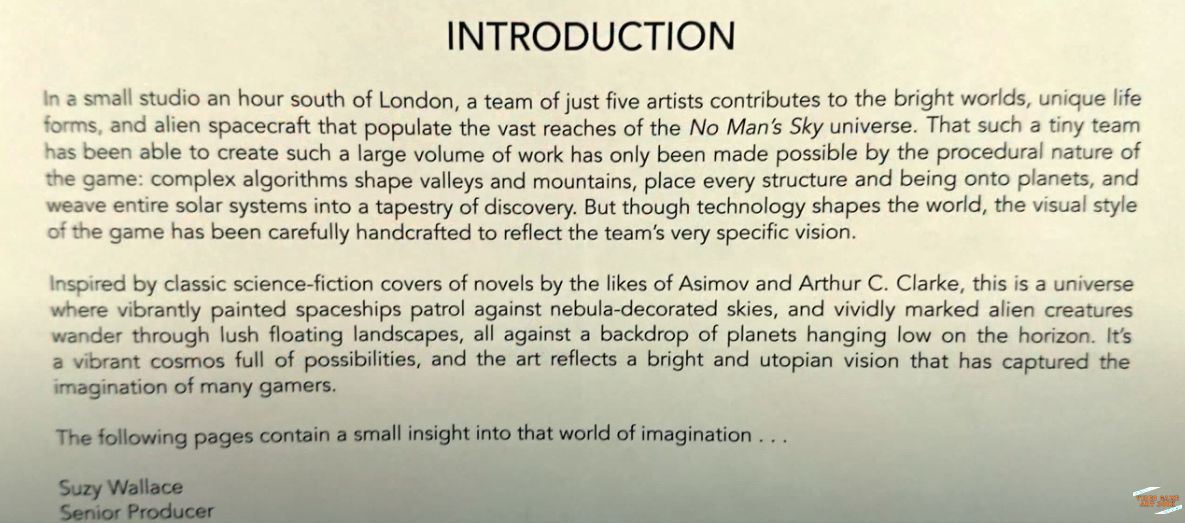 Suzy Wallace ist eine Senior Produzentin von Hello Games. Sie schrieb die Einleitung zu The Art of No Man's Sky, einem kleinen Buch, das Teil eines Vorbestellungspakets war.