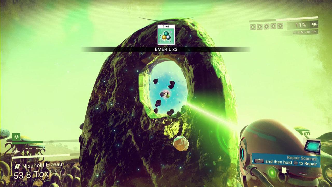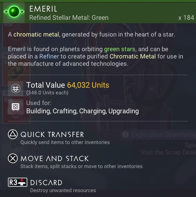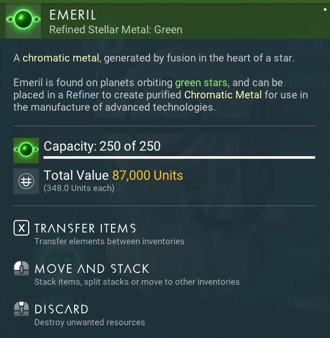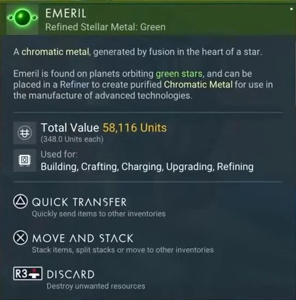 El emerilio se encuentra en planetas que orbitan estrellas verde, y se puede colocar en un refinador para crear Metal cromático purificado para usar en la fabricación de tecnologías avanzadas.