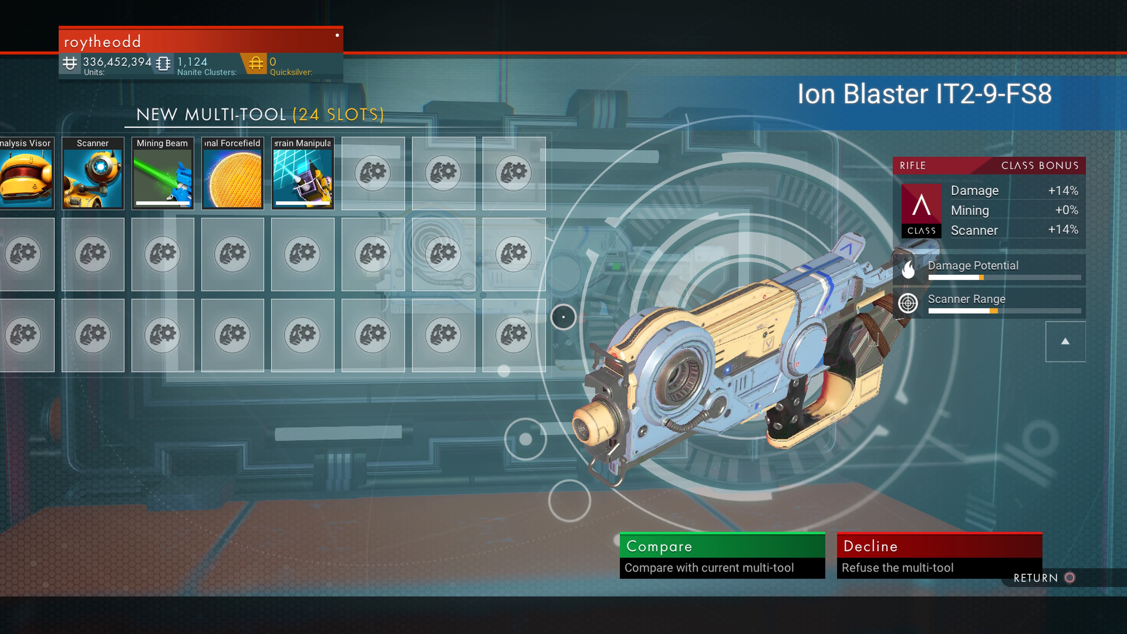 Las multiherramientas alienígenas, experimentales y royales, mucho menos comunes que las pistolas y los rifles, reciben bonificaciones altas a muy altas para el daño, la minería y el escaneo, aunque los dispositivos alienígenas favorecen el daño y los dispositivos experimentales y reales favorecen el escaneo. El número de ranuras de los dos últimos puede variar de muy pequeño a muy grande dependiendo del tamaño físico. Cada arma se puede actualizar a 60 ranuras siempre que se actualice primero a la clase S.