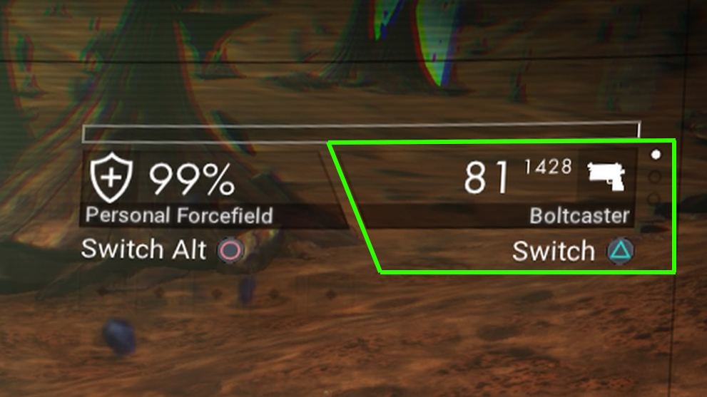 Hay una variedad de haces y proyectiles que puede emitir la multiherramienta. A menudo se les llama "armas". Solo se puede seleccionar un arma para usar a la vez. El arma seleccionada se muestra en el Indicador de arma, que forma parte de la interfaz de usuario mientras el avatar está a pie. Se encuentra en la esquina superior derecha de la pantalla, donde hay una barra con dos cuadros debajo. El indicador de arma en sí es el cuadro de la derecha y también incluye los puntos a la derecha del cuadro. El arma seleccionada se nombra en el cuadro. Los puntos indican cuántas armas están instaladas y qué número está seleccionado.