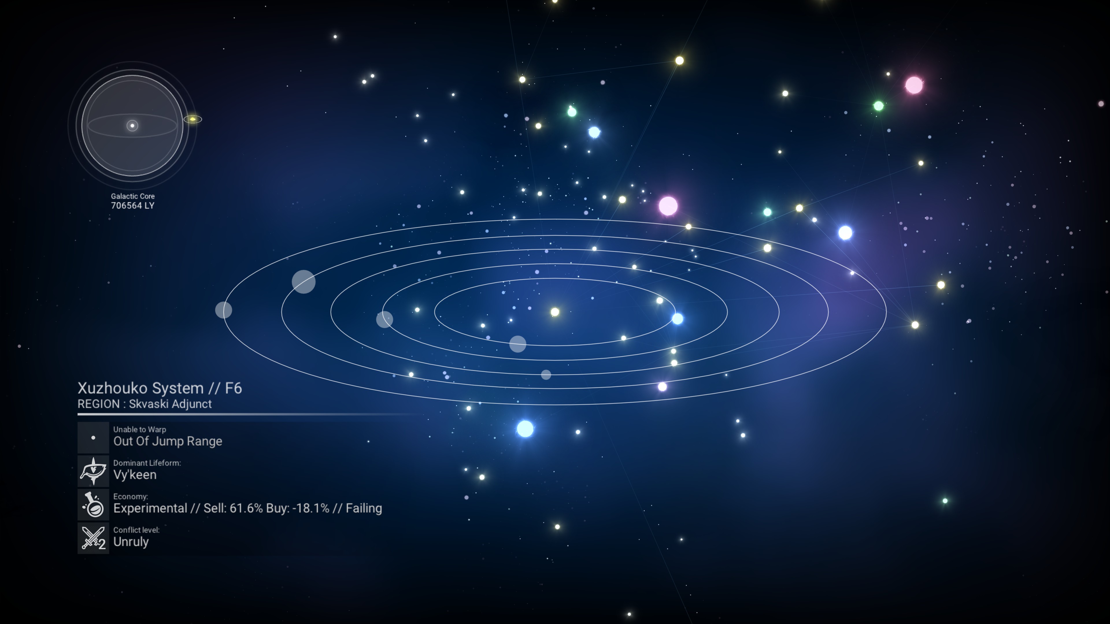 La interfaz del mapa galáctico muestra información clave sobre el sistema seleccionado. La información que se muestra es: