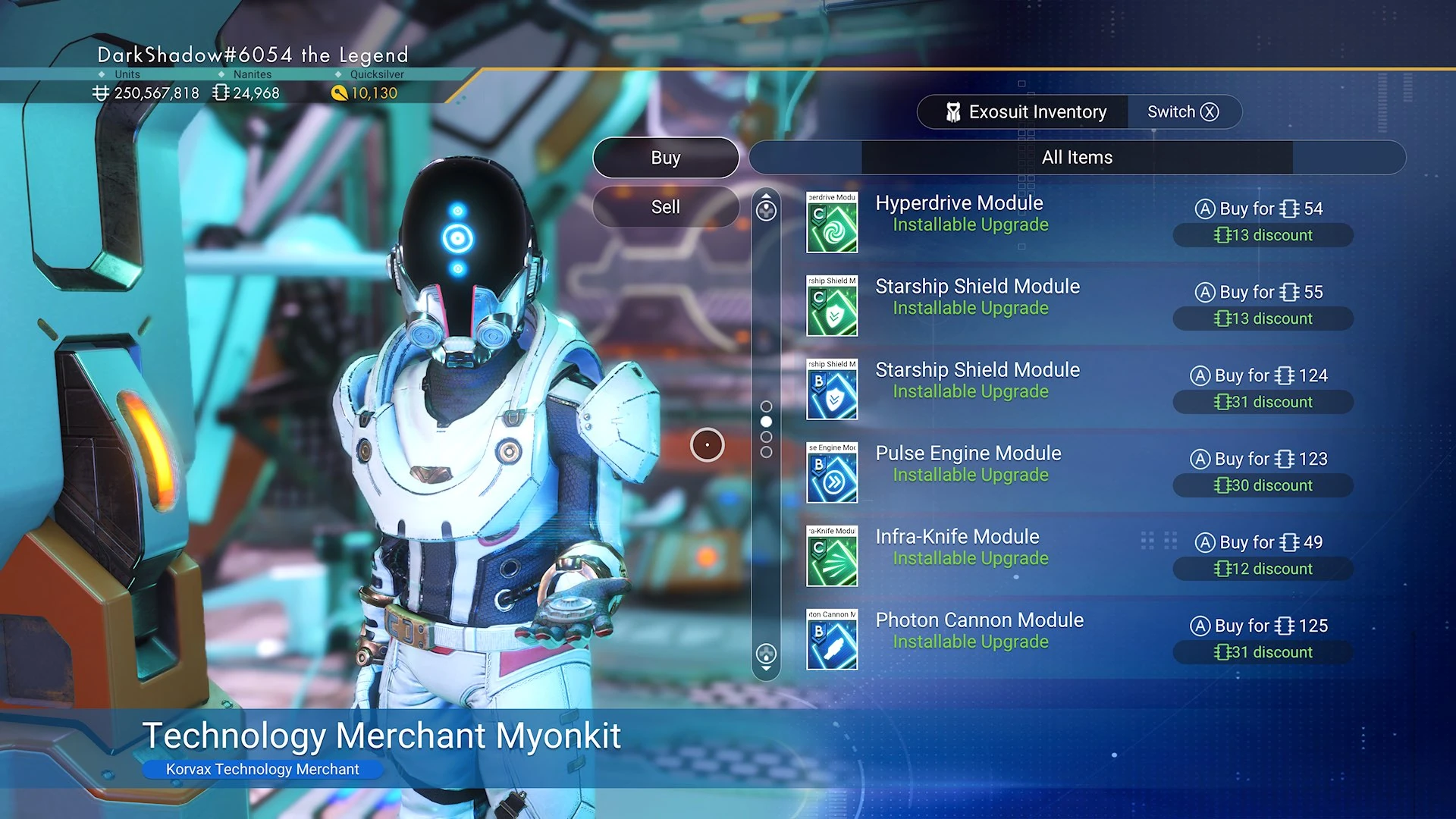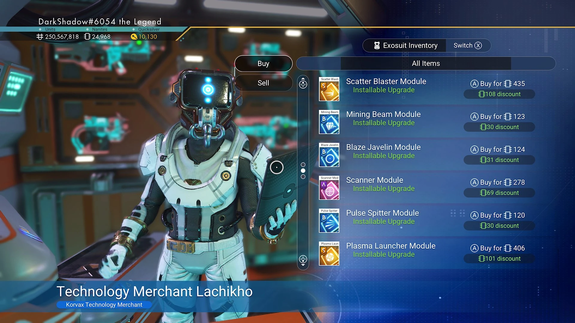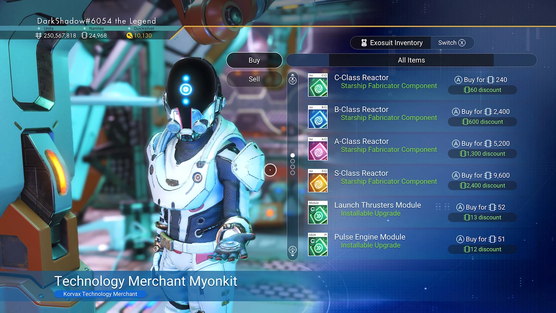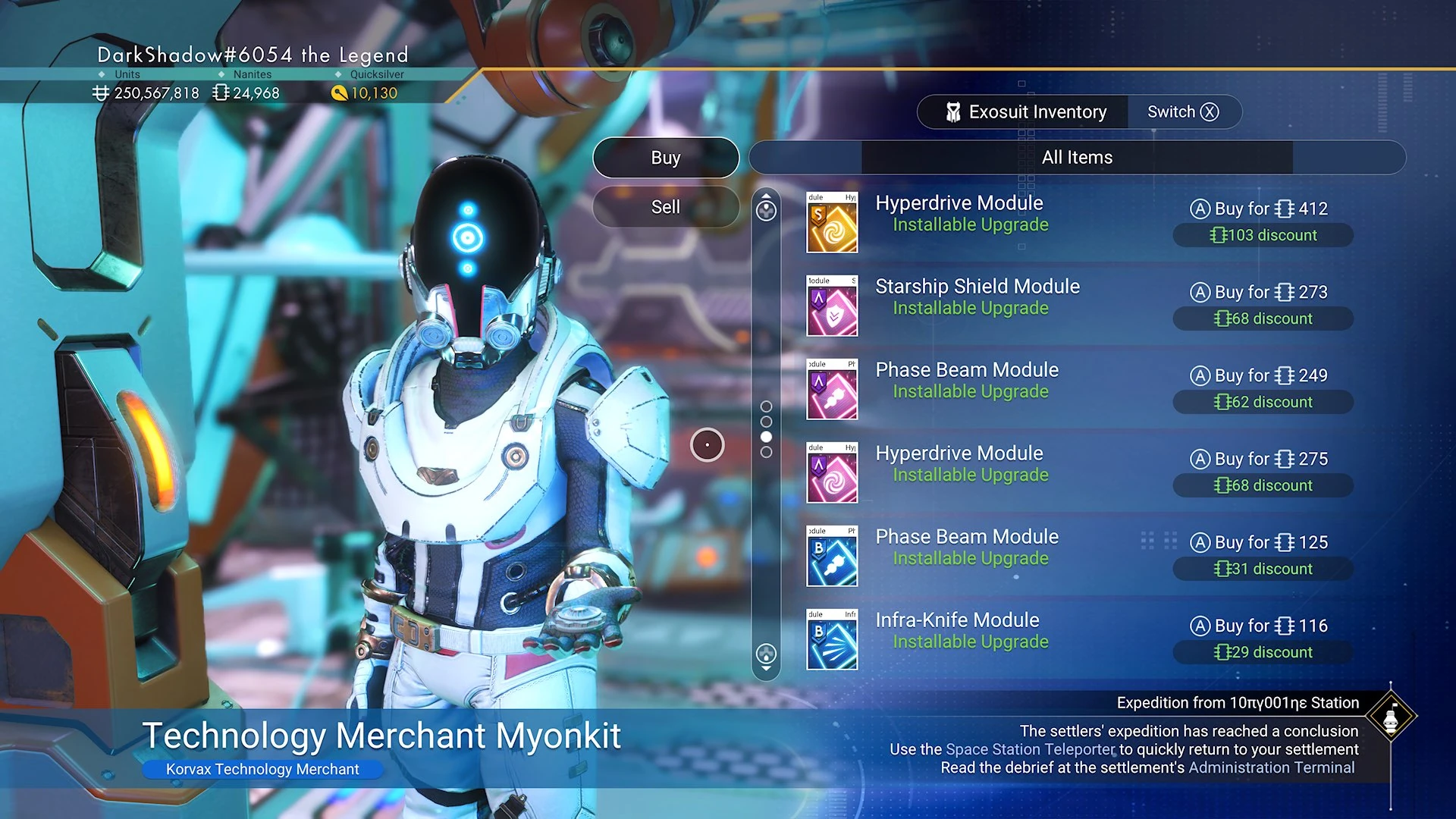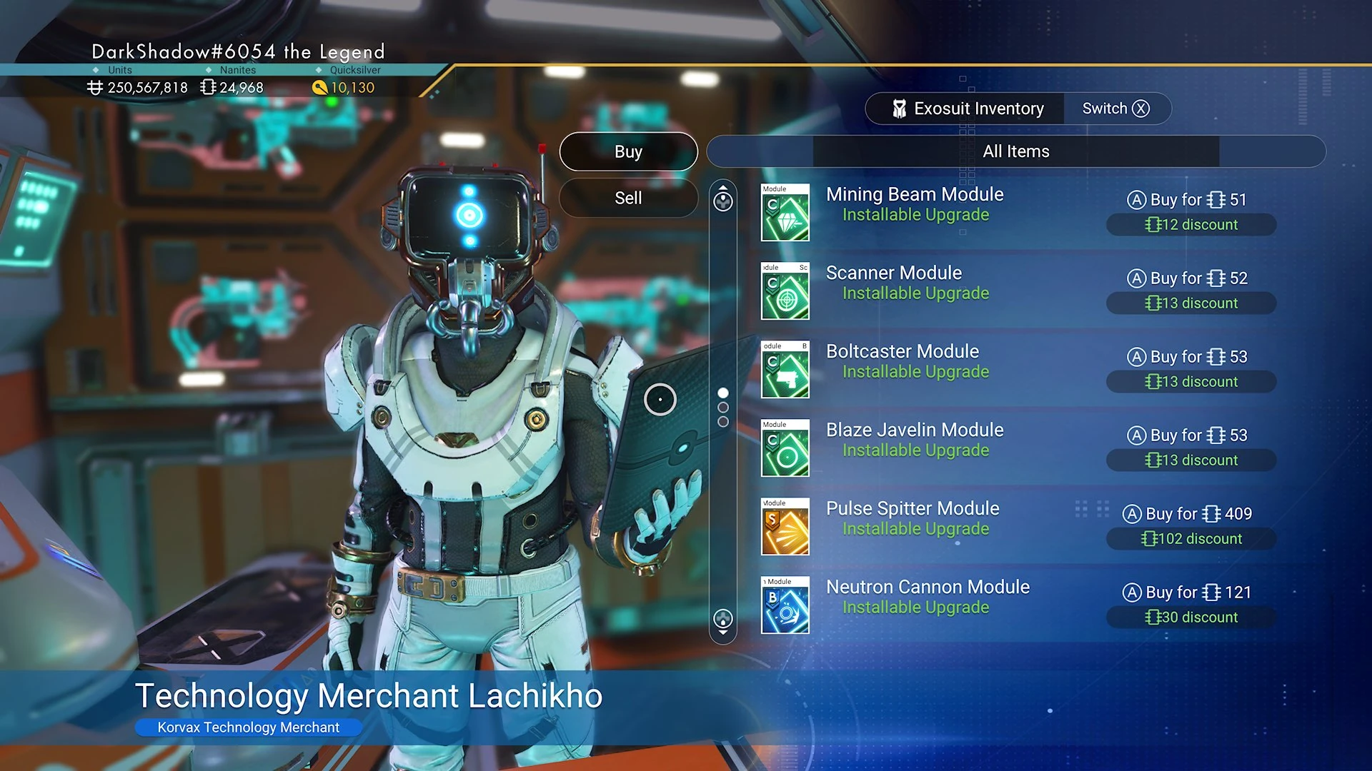 The space station merchants include those for Multi-tool/Starship/Exosuit Tech, as well as the Vehicle Shop. They offer the following items for sale:
