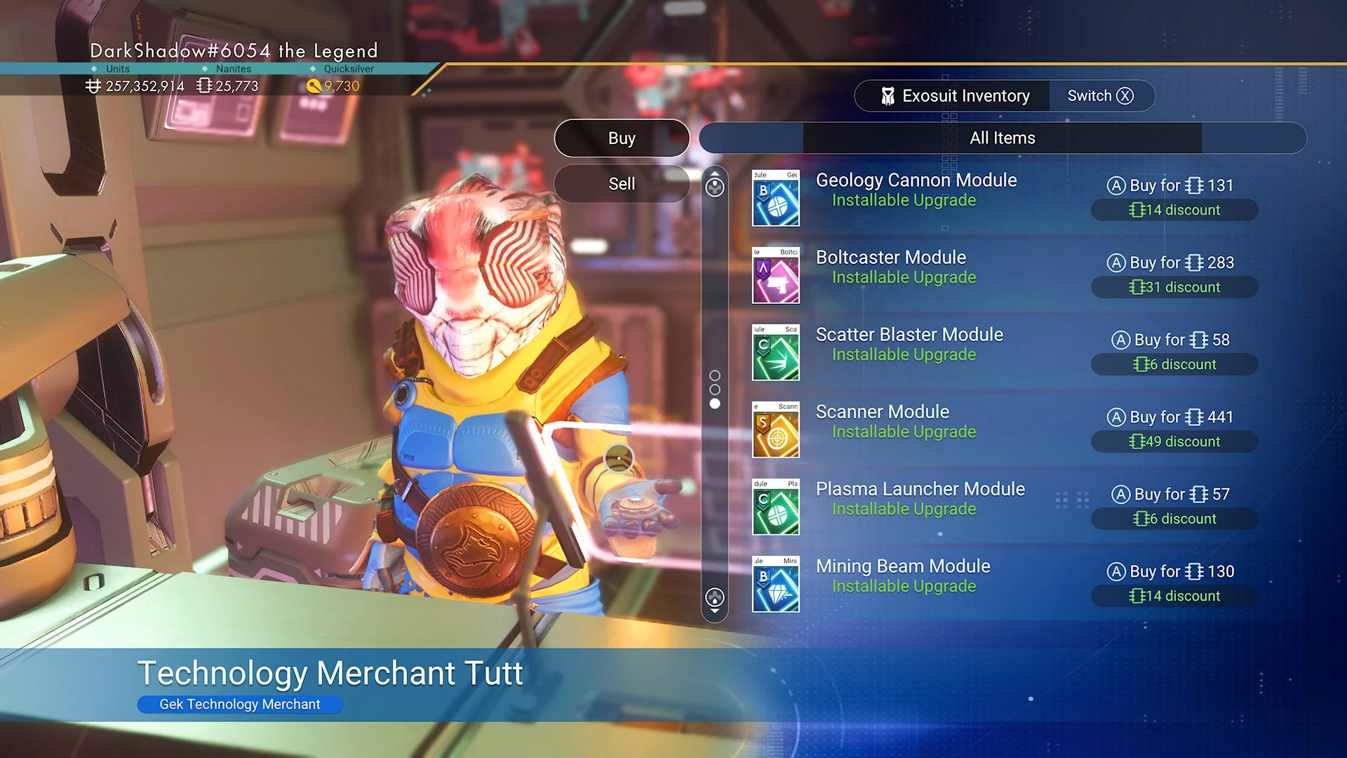 The space station merchants include those for Multi-tool/Starship/Exosuit Tech, as well as the Vehicle Shop. They offer the following items for sale: