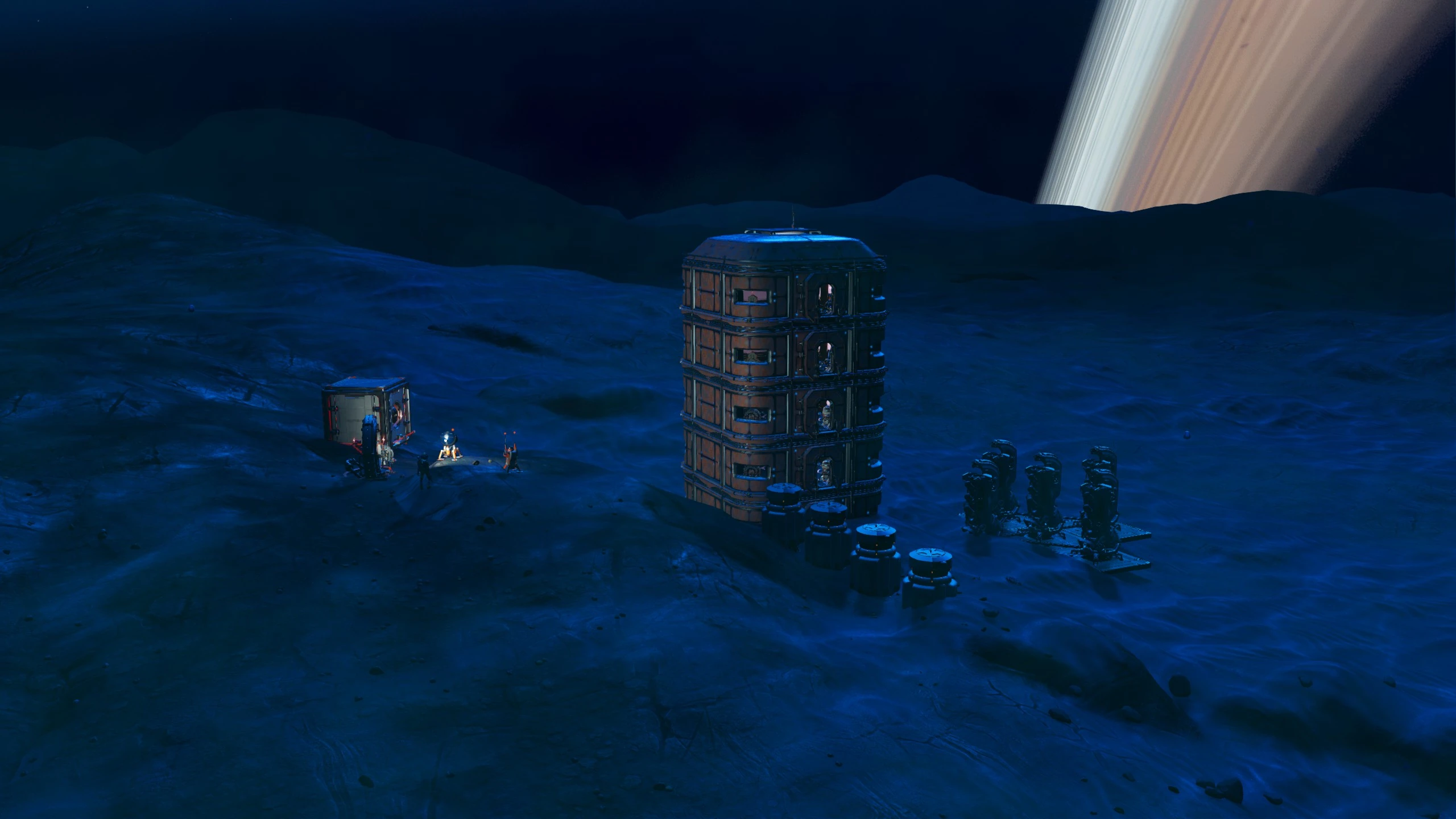A simple four level tall tower with attached mining and storage facilities.