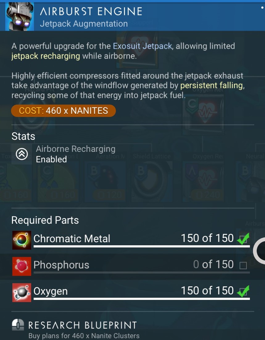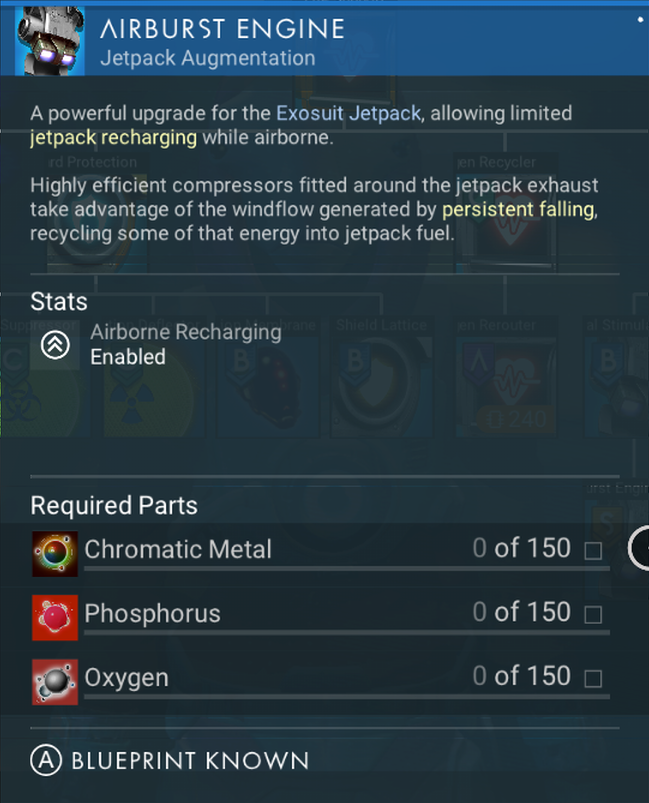 A powerful upgrade for the Exosuit Jetpack, allowing limited jetpack recharging while airborne.