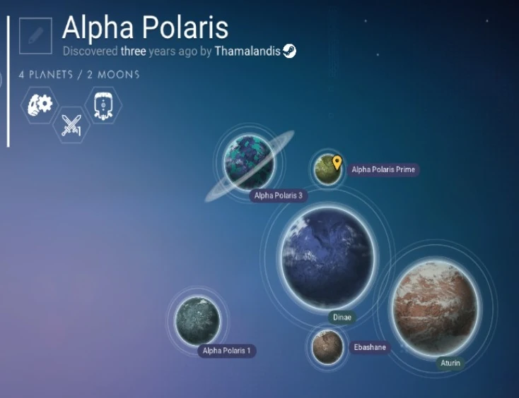- Ebashane was the former center of the system and is Dinae's second moon. The former Alpha Polaris Prime and oceanic gaia moon has transformed into a desert world.