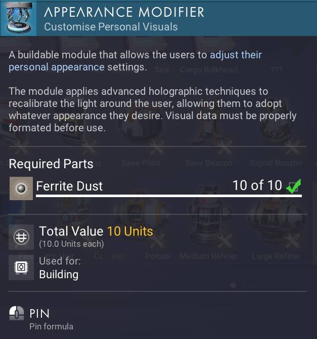 Appearance Modifier is a base building product that allows the player to change their avatar.