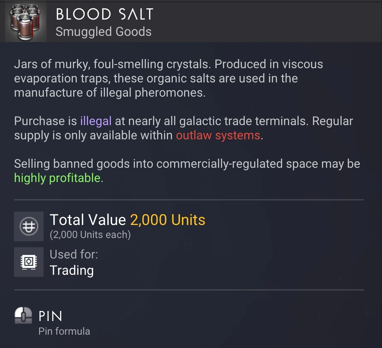 Purchase is illegal at nearly all galactic trade terminals. Regular supply is only available within outlaw systems.