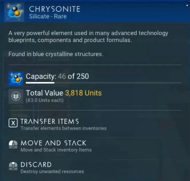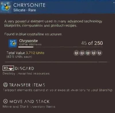 Chrysonite can be mined from blue crystalline structures on planets or bought from merchants. Commonly found on the surface of cold planets. Chrysonite crystals were also found on paradise type planets.