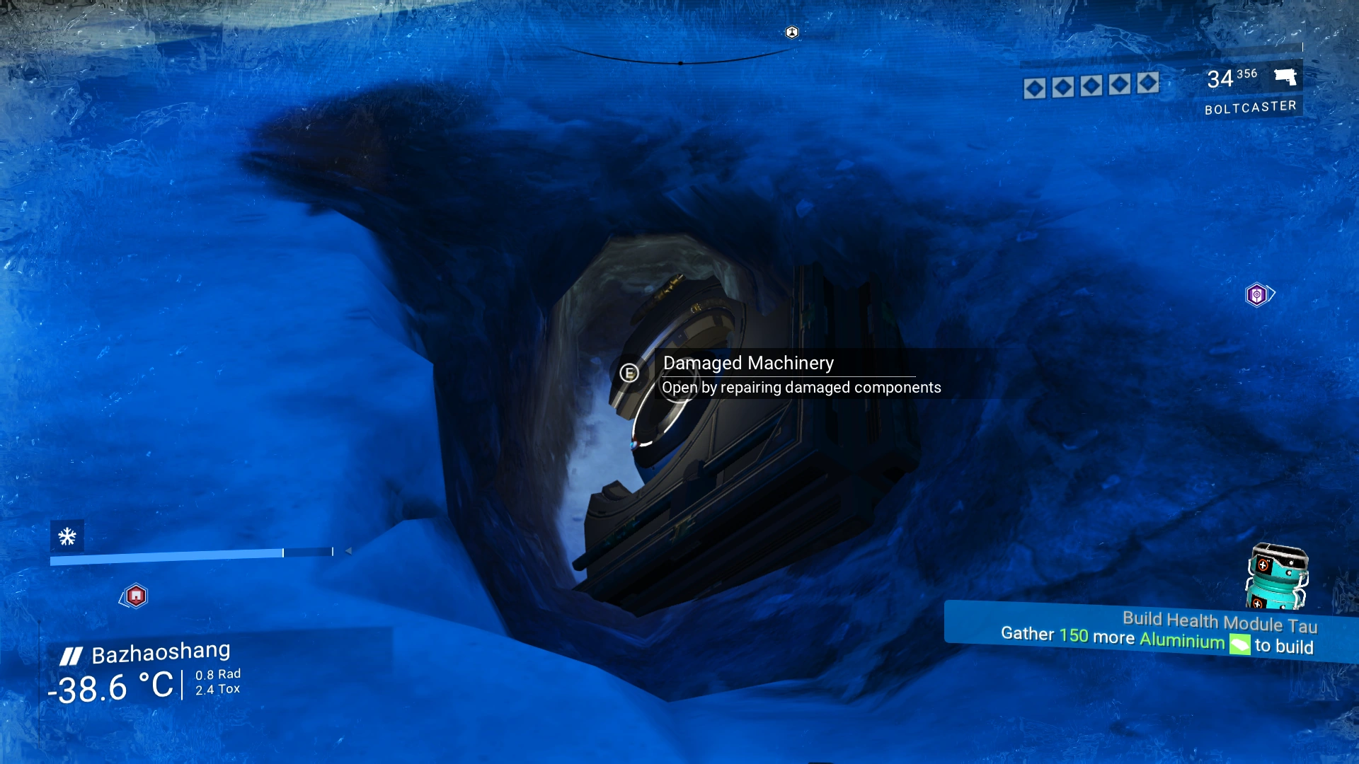 Crashed freighters can be located after solving a puzzle at a Transmission Tower, upon activating a Planetary Chart (Emergency Cartographic Data), or by normal exploration. Through the use of tools such as the Terrain Manipulator, Plasma Launcher, or Geology Cannon, you can uncover storage units that contain Nanite Clusters, units, or valuable products, with the exact possible contents varying based on whether abandoned mode is active for the current save. Each crashed freighter has a Distress Beacon that will grant a blueprint and start the secondary mission. Note that the containers can emit deadly radiation that goes past any protection measures, although it can be cut off by entering a Minotaur power suit or retreating to a safe distance.