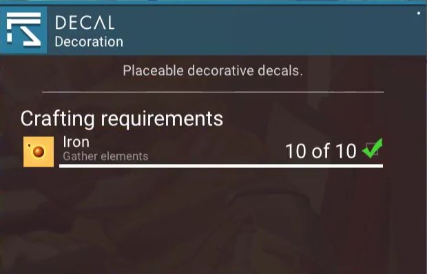 Decals are used in personalizing and decorating a player's home base or freighter. The blueprint provides 13 different varieties, including numbers and the No Man's Sky logo. One of the more common usages is labeling rooms and hallways for identification purposes.