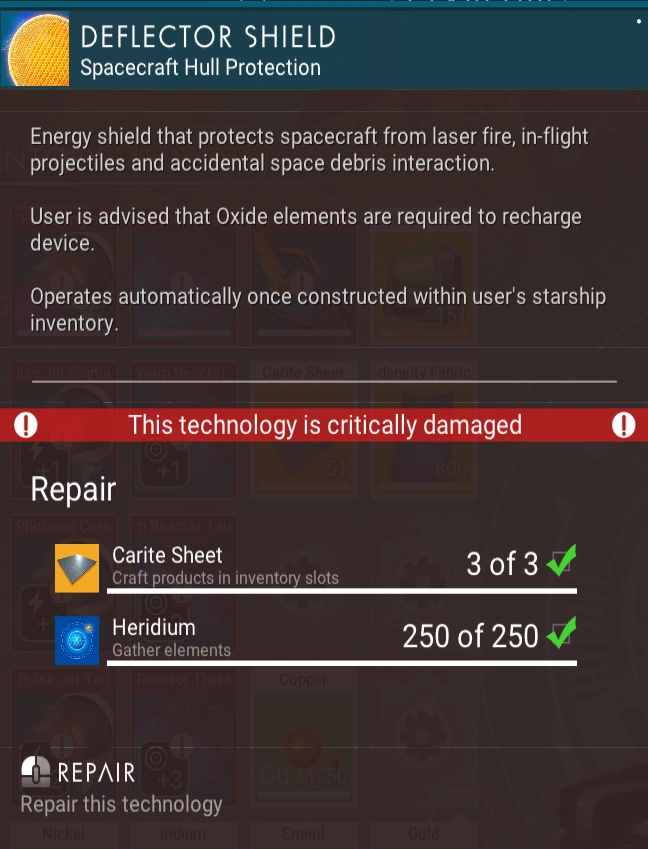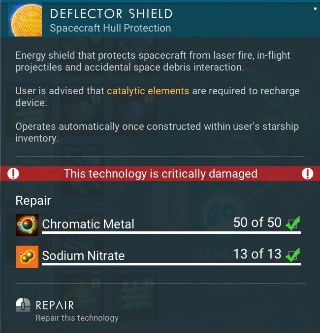 Deflector Shield can be repaired using the following ingredients: