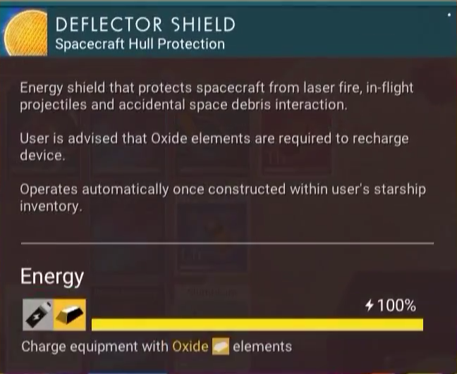 Deflector Shield is the standard means of protecting a starship against enemy fire (no collision damage from space objects like asteroids or space stations). It will prevent enemy shots from making contact with the ship, but will regenerate slowly while not fully charged, necessitating manual recharge with Sodium, Sodium Nitrate or Starshield Battery for meaningful durability extension in combat. If not recharged and permitted to deplete, the shield will drop, leaving the starship vulnerable to critical damage.