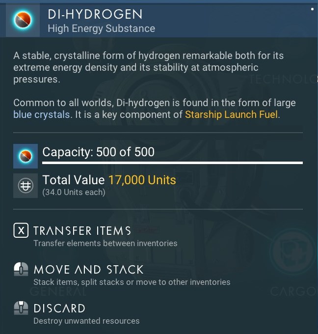 Some Galactic Trade Terminals found on Space Stations, Trading Posts and Colossal Archives will sell Di-hydrogen Jelly in bulk. Unlike the method previously described, refining Di-hydrogen directly from sourced Di-hydrogen Jelly is simpler, faster and results in a higher yield. One stack of Di-hydrogen Jelly (20) can be refined into 800 Di-hydrogen in 80 seconds. Using multiple refiners can speed up this process considerably.