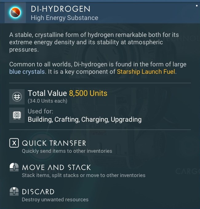 Di-hydrogen (H) is a resource and one of the earth elements. It is a main ingredient required to craft fuel for both starships and frigates.