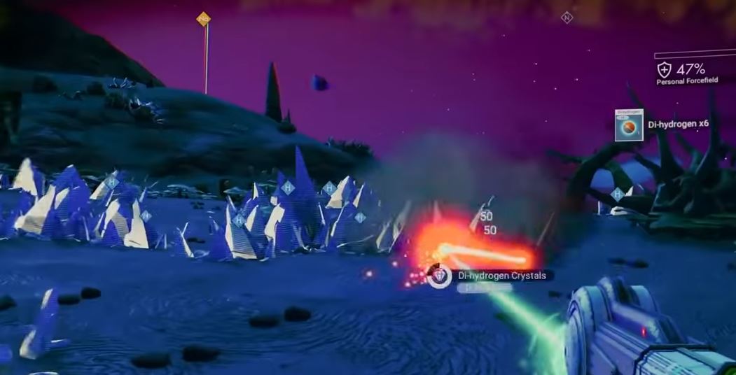 Common to all worlds, Di-hydrogen is found in the form of large blue crystals. It is a key component of Starship Launch Fuel.