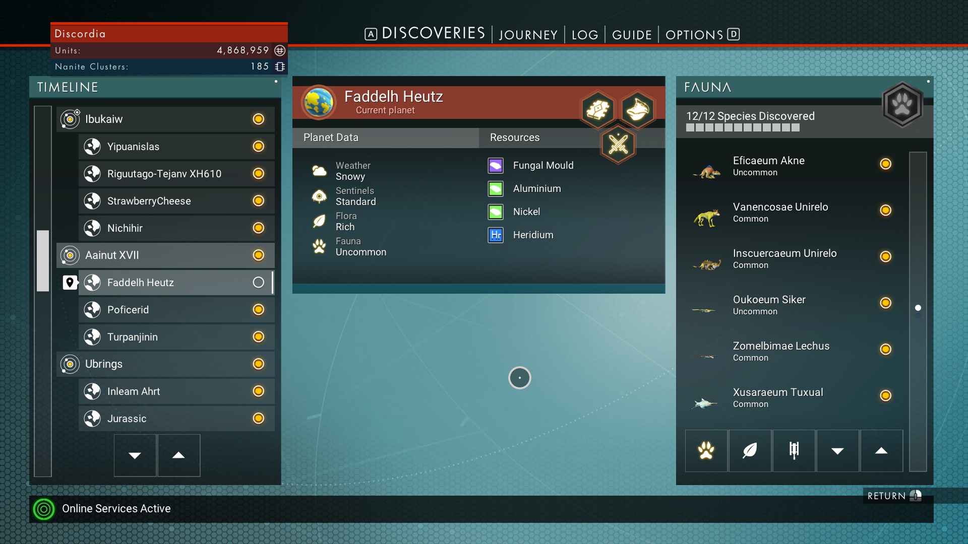 - The Exploration Guide screen will always show the correct number of creatures to be discovered on a planet. The Planet - Discovery Menu will reflect an earlier era of creature/fauna/flora/mineral counts if it was discovered in the past. These will be reset and correctly loaded if you warp out of the system and then return as this will force a refresh of the planet discovery information.