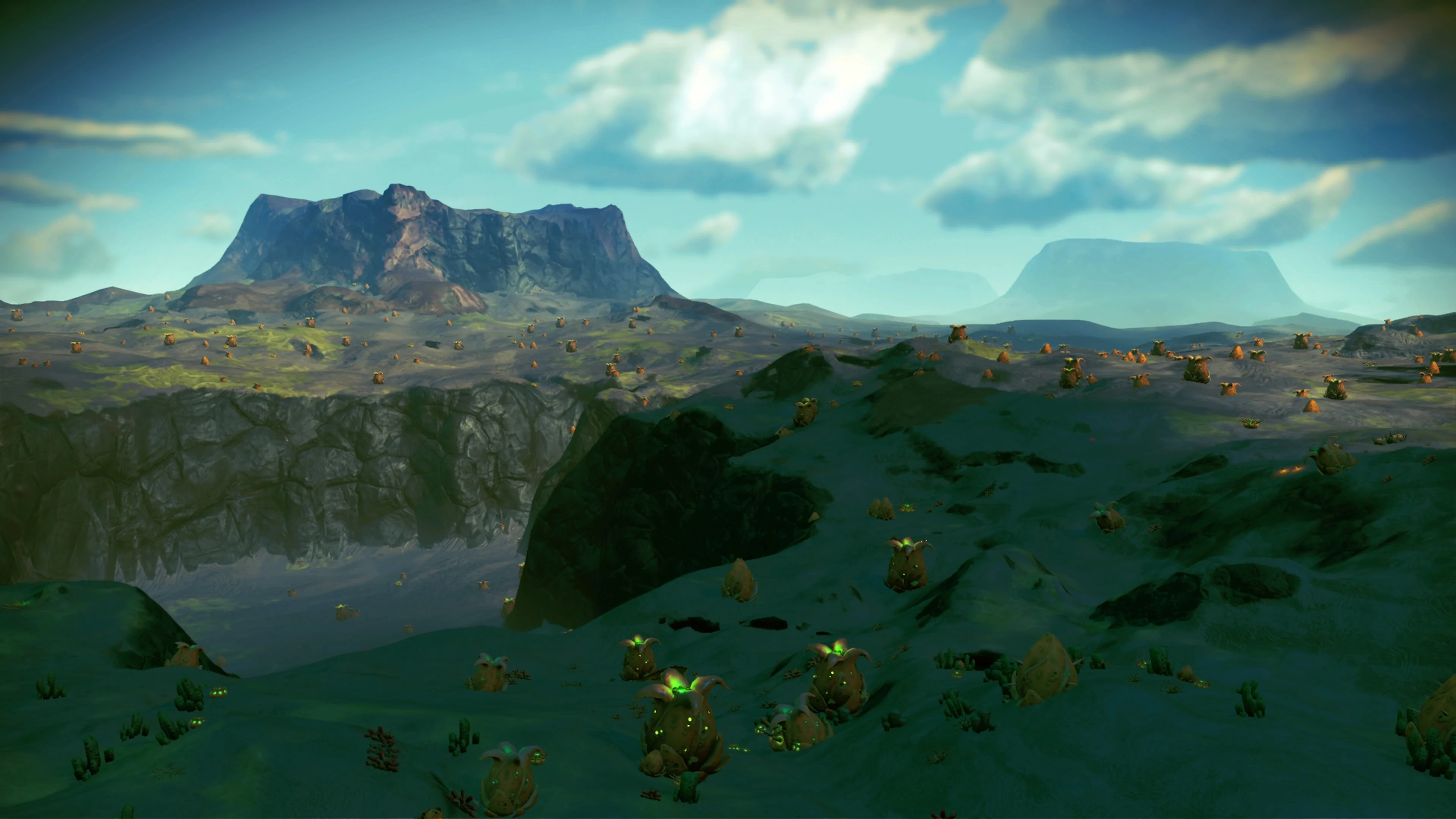 The Irradiated surface is home to large gorges and buttes. The surface appears to be too irradiated for walking fauna as all the creatures on the planet are variations of Agnelis and Rhopalocera.