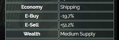 The Sell and Buy percentages for a system correspond to the variation of the tradeables' buying and selling prices compared to the galactic average. These two percentages can be displayed in the infobox for a system page in this wiki, and will show as E-Buy and E-Sell.