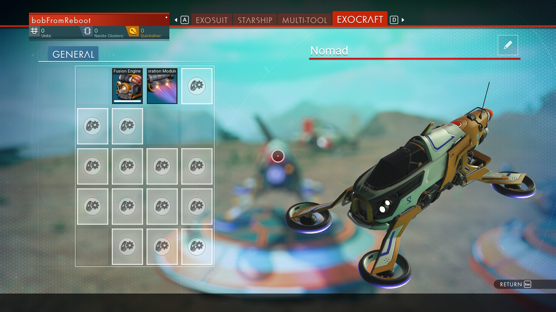 The Nomad is a hovercraft with the ability to float on water. This makes it great at crossing terrain that most other Exocraft struggle with. Additionally, its high speed (second only to the Pilgrim) makes it ideal for travel.