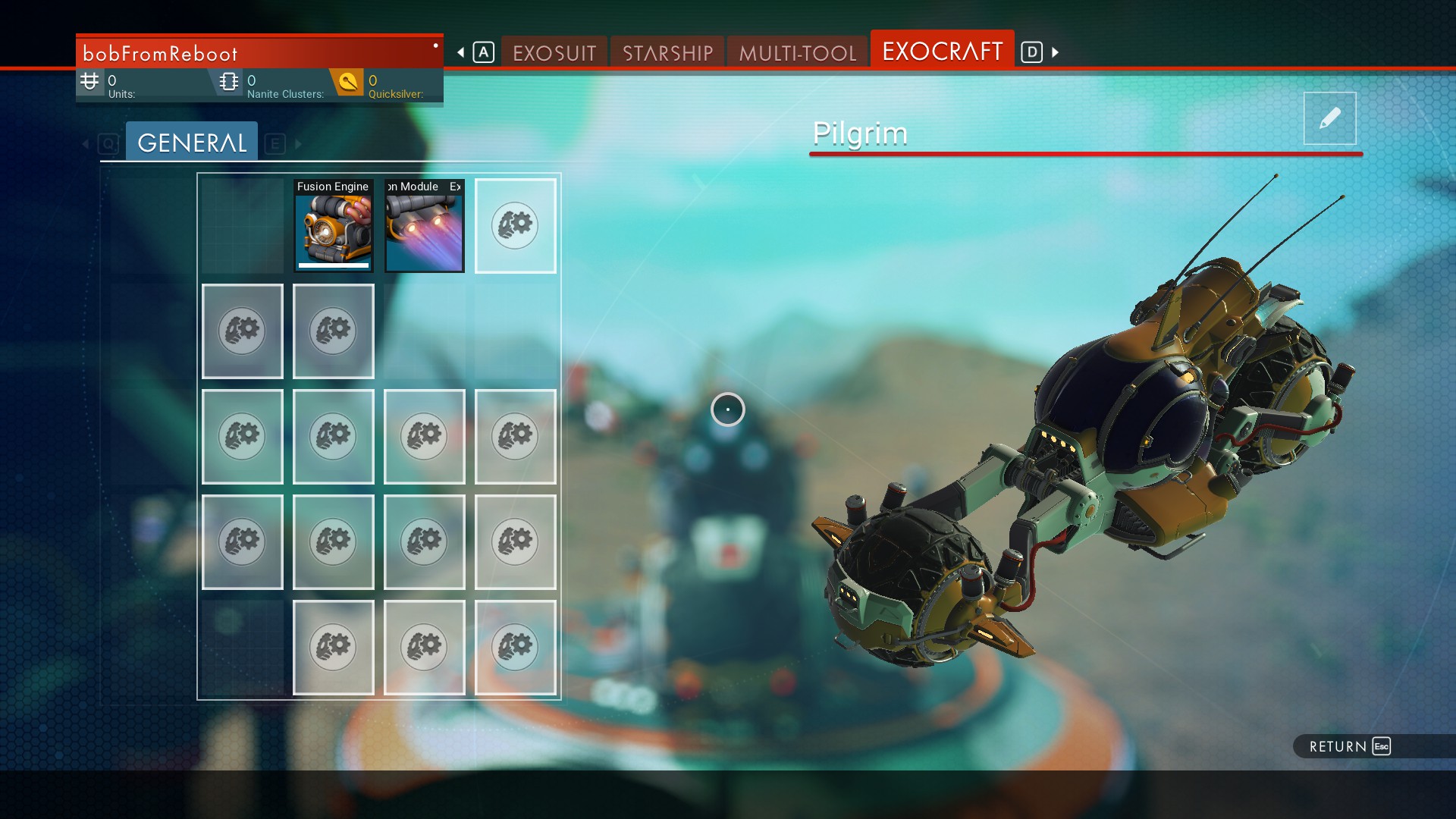 The Pilgrim is a two-wheeled, motorcycle-esque vehicle that possesses the highest top speed of all Exocraft. This makes it perfect for covering large amounts of ground in short periods of time, though such high speeds can make it difficult to control on rough terrain.