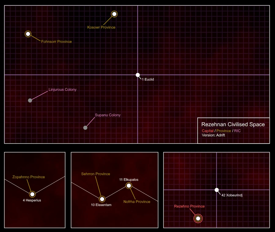 Rezehno was initially established by a merchant group exploring the Xobeurindj galaxy, and descends from a series of civilisations from the North of Euclid. It has been in its current form since mid-2023.