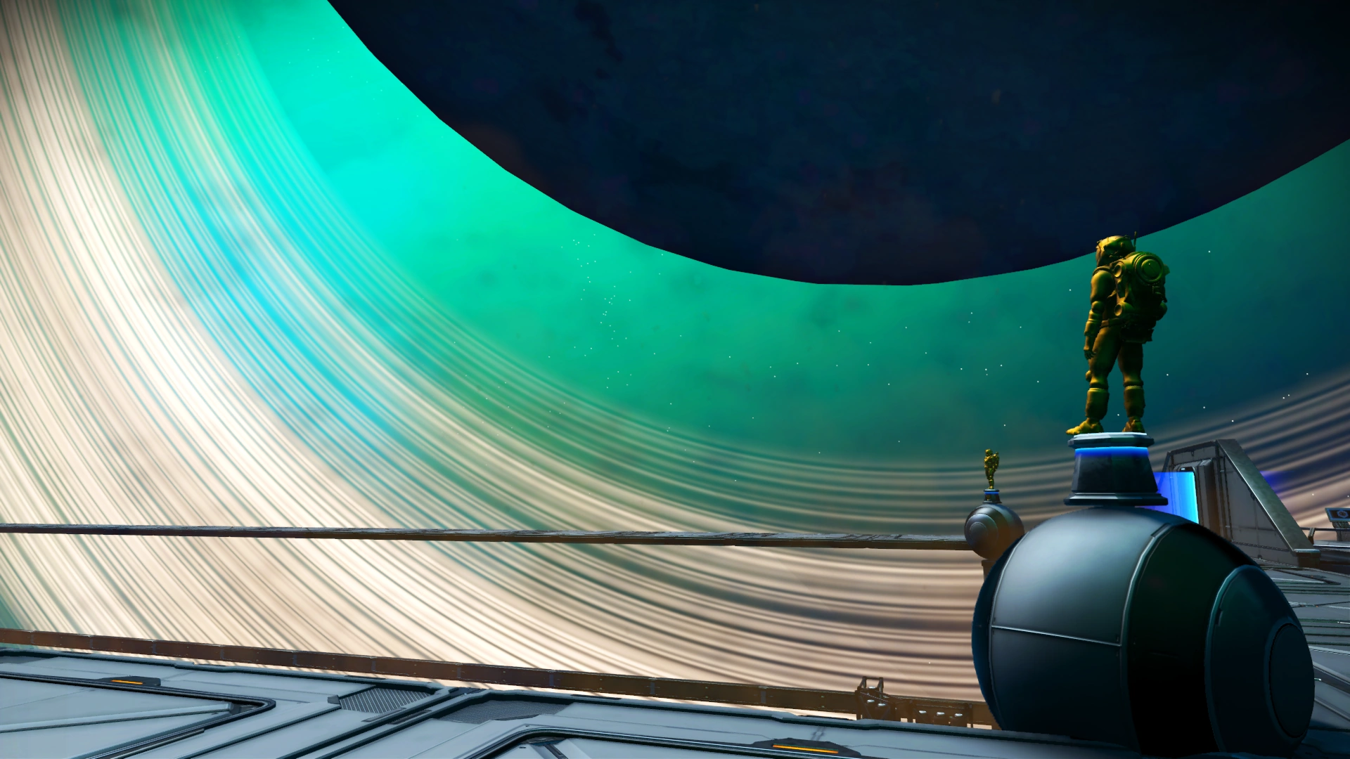 Gold Astronaut Statues watch over each corner of the arena, symbolizing the maximum-4-players (as of Update 1.59) able to fight in the arena at a single time. Anti-gravity generators (four small ones beneath each landing pad and one large one beneath the combat stage), keep the arena suspended motionless in the air.