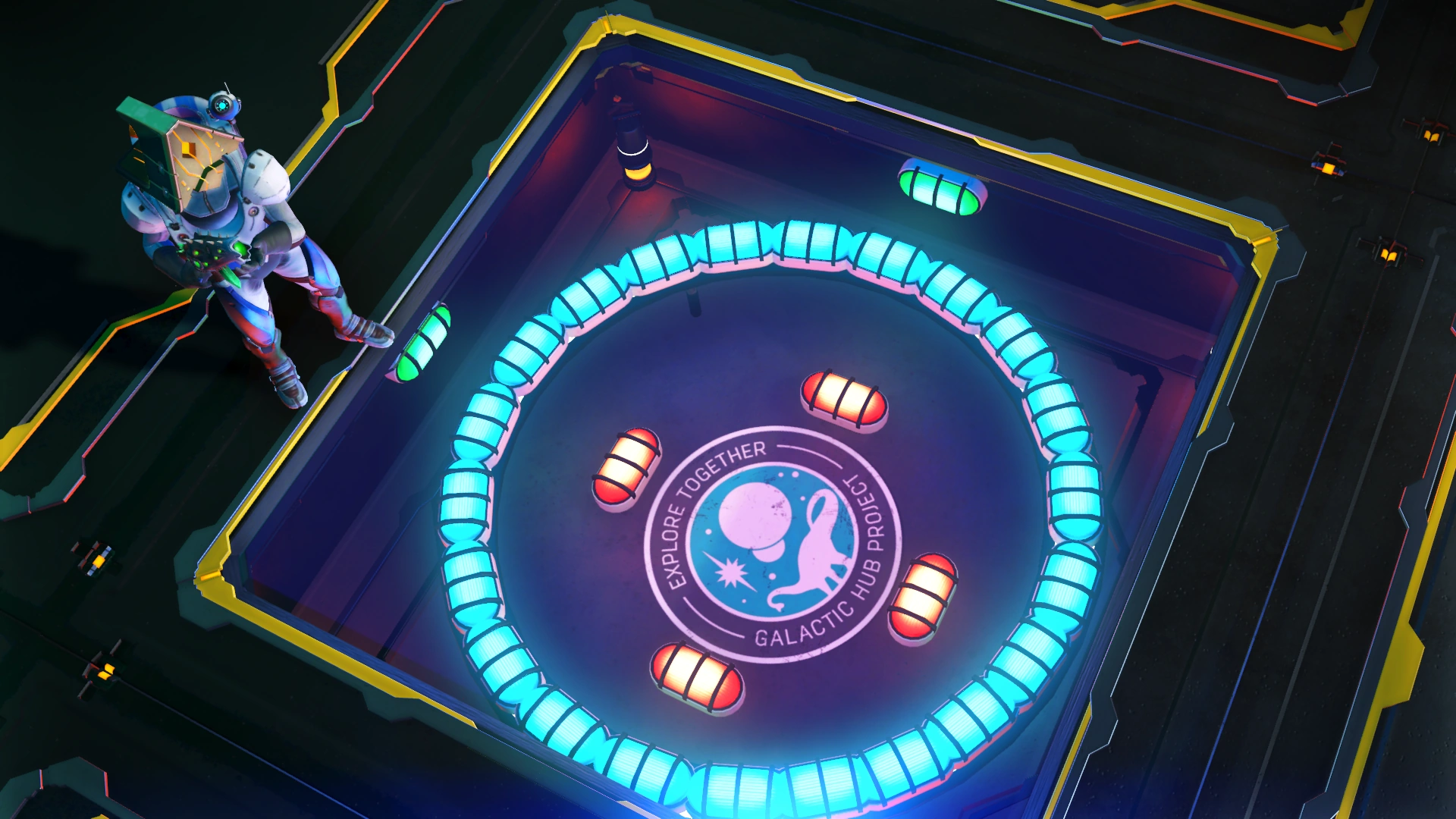 The Galactic Hub Emblem is featured in the center of the arena, brightly lit under a pane of glass.
