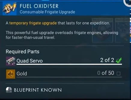 Fuel Oxidiser is a consumable product and one of the upgrades available for frigates. It is a temporary upgrade which reduces the expedition's duration of a frigate fleet for a single expedition by 10 points.