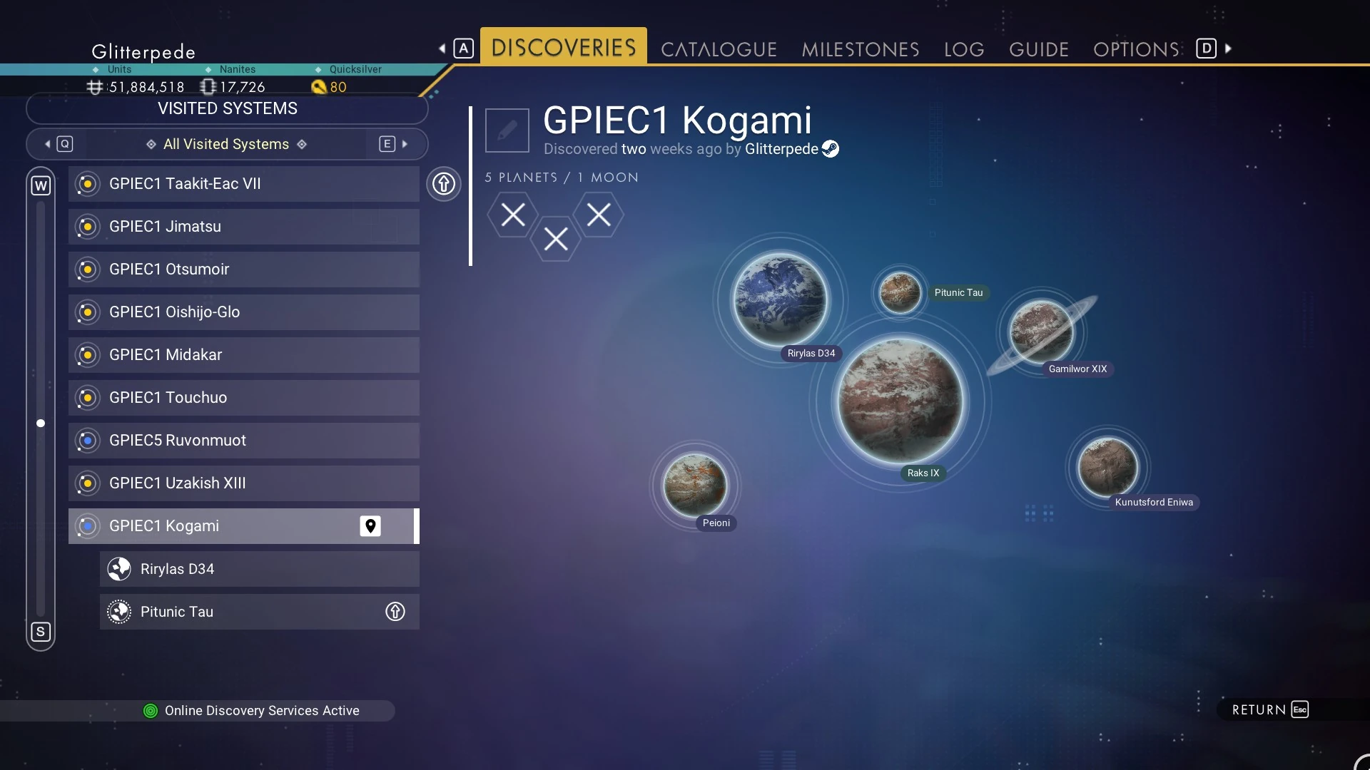 GPIEC1 Kogami is a logistical hub for the Glitterpede Imperial Exploration Corporation, with planet Raks IX hosting multiple Activated Indium mines to help fund Corps operations. The GPIEC also regularly harvests strategic resources from lifeless worlds in the system, so as to acquire key materials without harming native organisms.