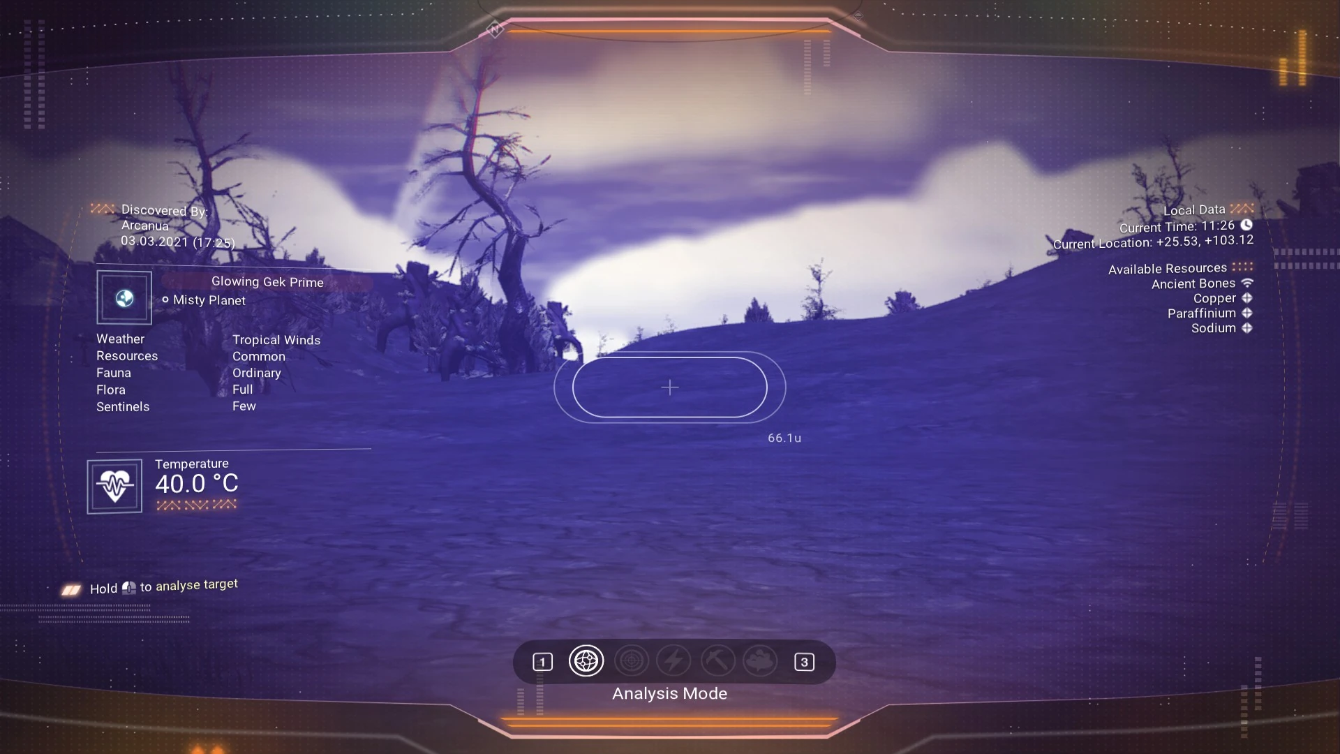 A marsh planet with green grass and light grey dirt. The atmosphere of Glowing Gek Prime is grey. This planet observes no extreme forms of weather, nor any kind of storm. During the day temperatures peak at 104.6F and drop as low as 73.7F in the evening. The surface of this planet is mostly rolling hills with scarce mountains, there are semi regular rolling mists, constant light drizzle and spores that also occur on this planet. There are some flora that exhibit glowing tendencies in the form of small mushrooms.