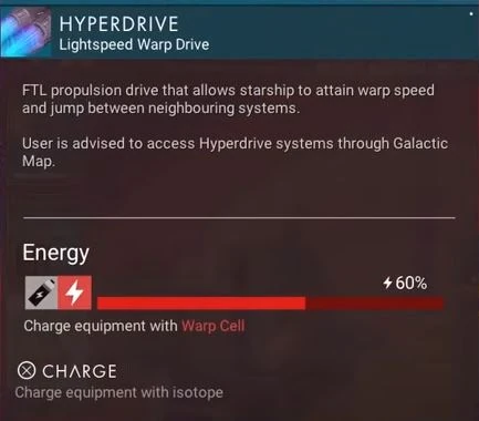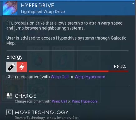 The Hyperdrive is the starship's faster-than-light propulsion drive to aid players travel across galaxies. It is also known as a warp drive. By default, each warp between star systems consumes one Warp Cell which is the equivalent of 20% of the Hyperdrive's fuel supply. A hyperdrive can be pre-charged with up to 5 warp cells. It can also be fuelled with a Warp Hypercore.