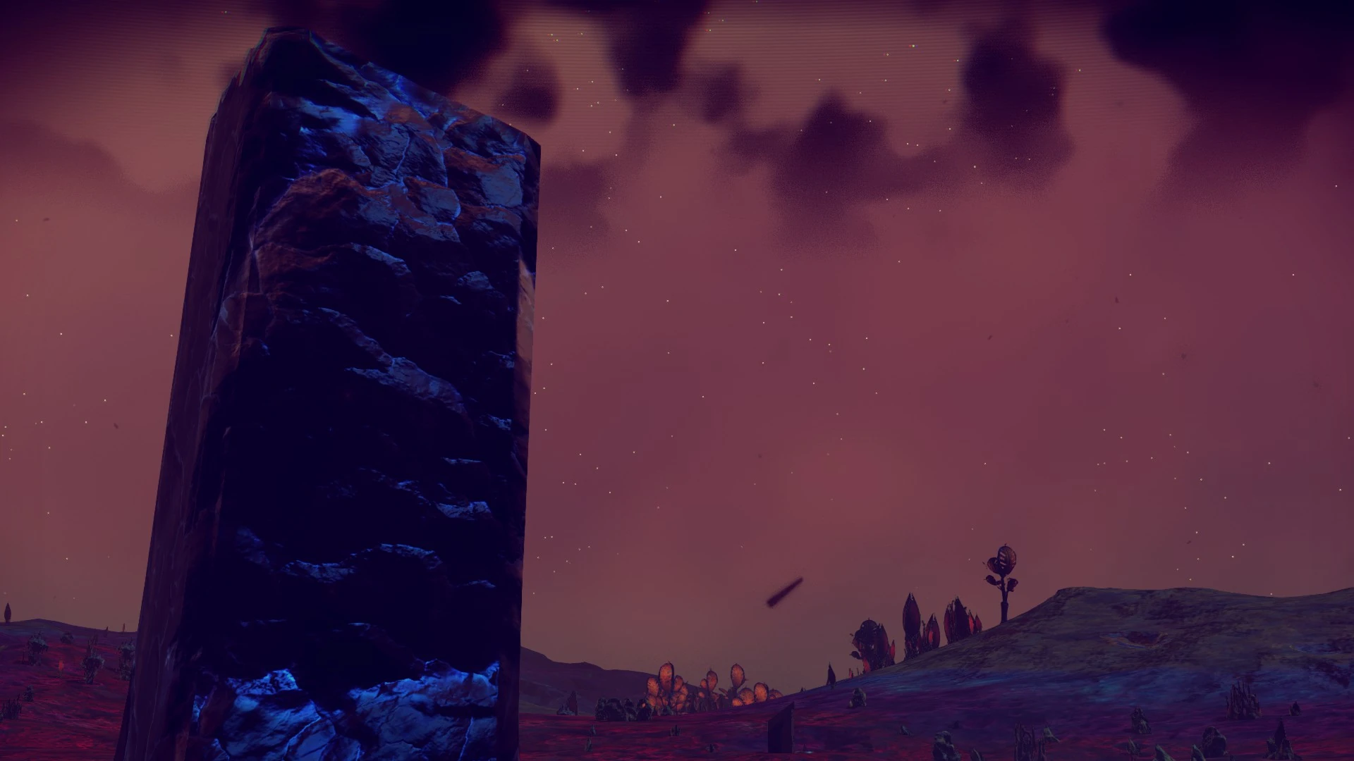 Red is the dominant colour, being found in the flora, ground and sky. Much of the surface is flat, with some copses and rocks dotting the barren landscape.