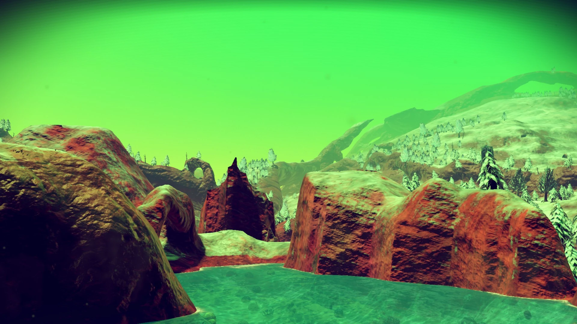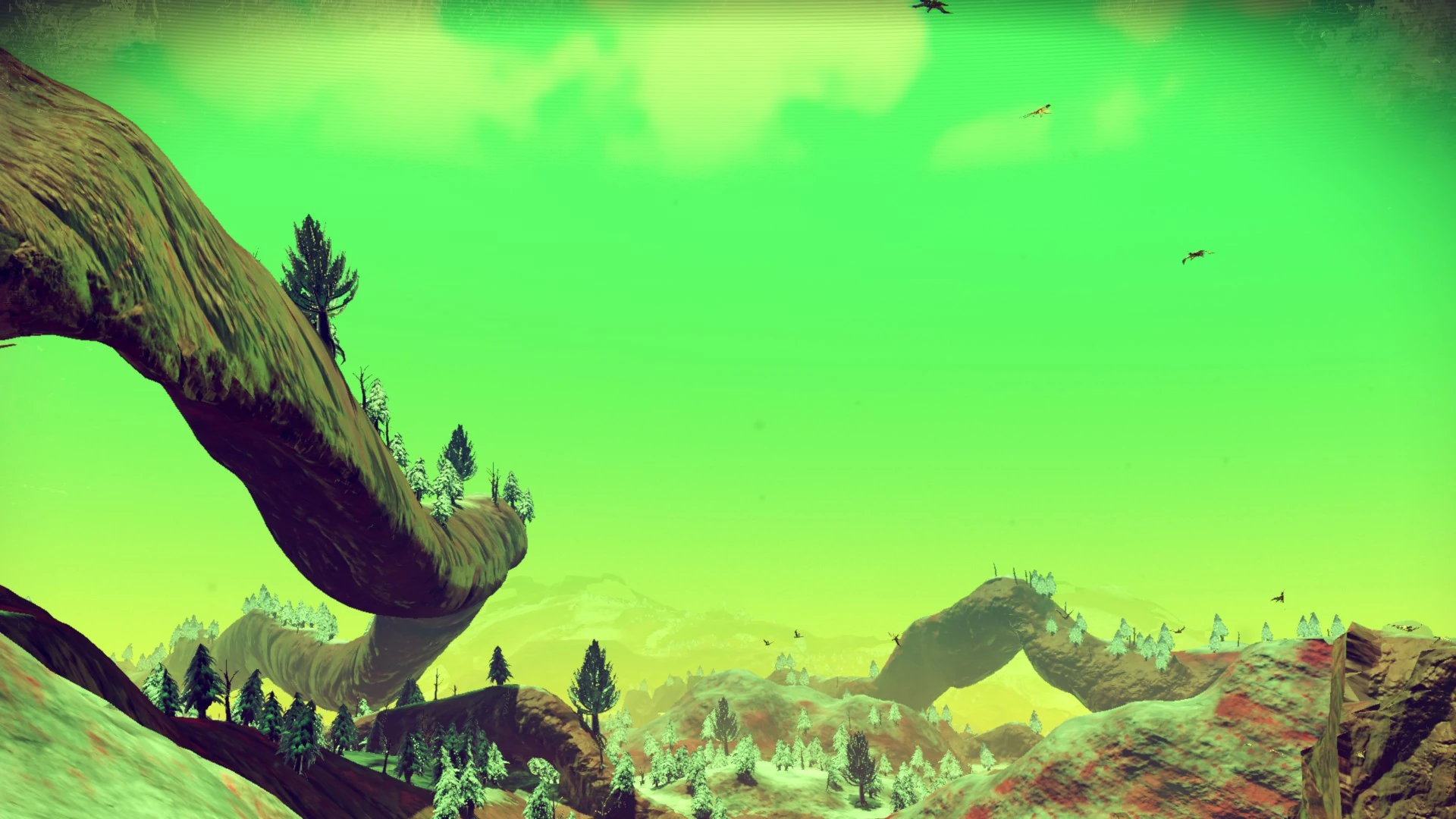 The most iconic features of this planet are the massive stone archers snaking through the landscape. The brown surface is covered with snow and conifers, contrasting with the clear green sky.