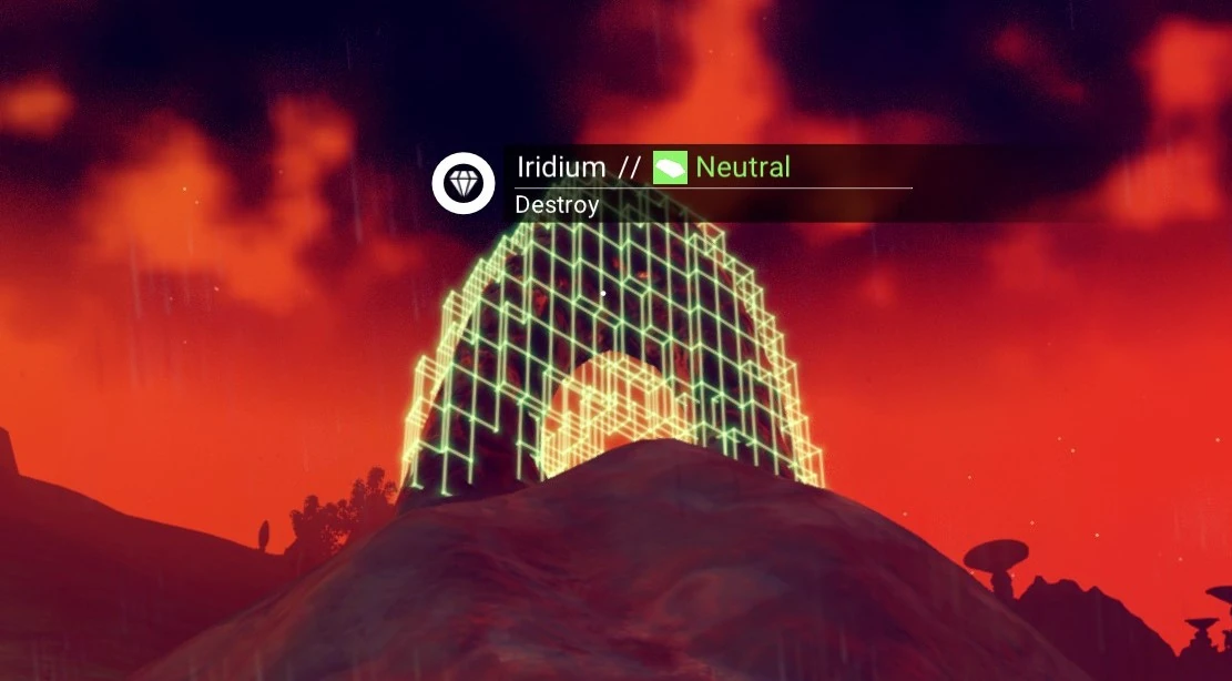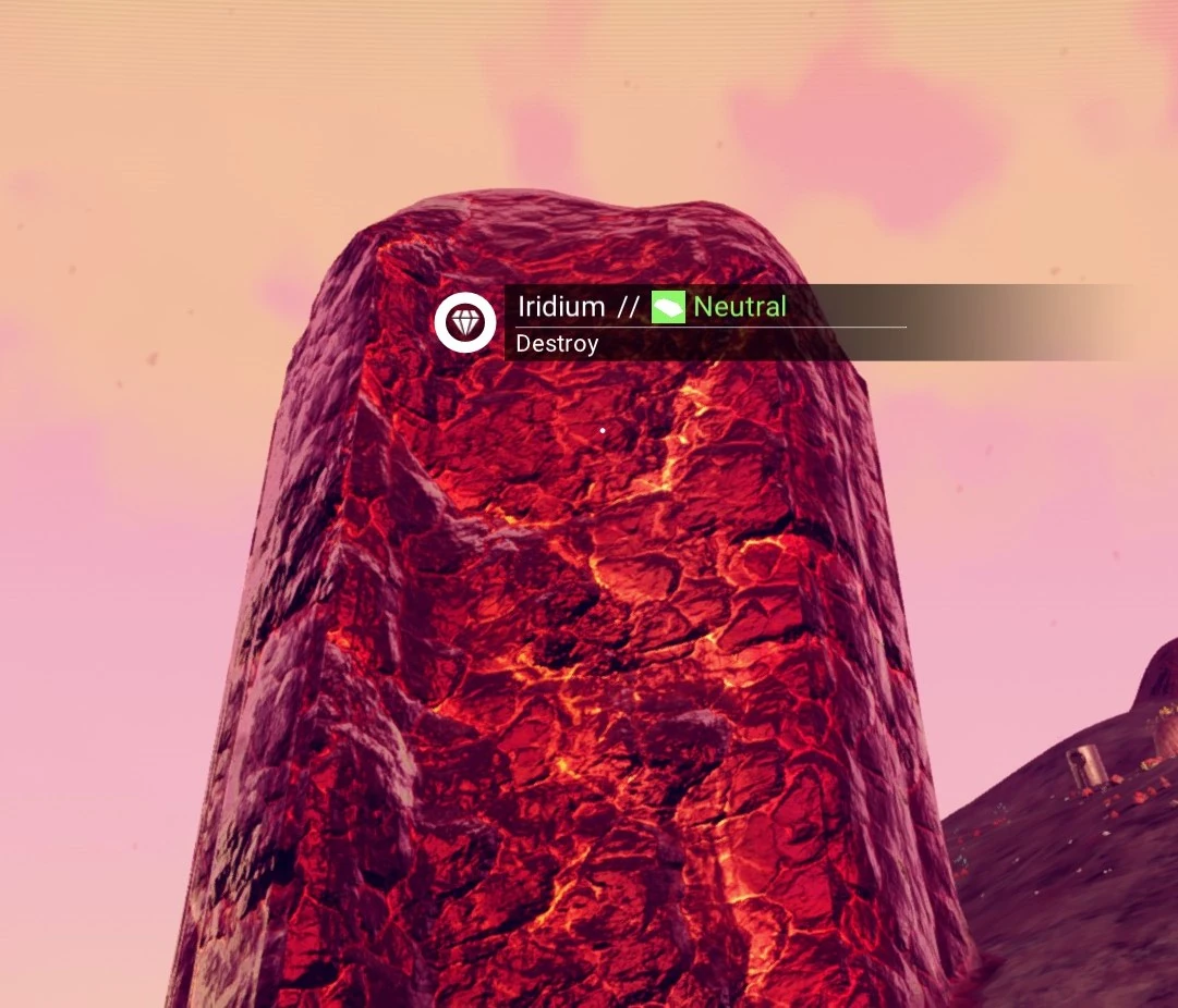 Iridium can be mined in space from asteroids of various types, where it most often appears as crystals in the shape of a multi-pointed star. Deposits can also be found on planets within arch shaped rocks, but are much rarer than other resource nodes found on planets.