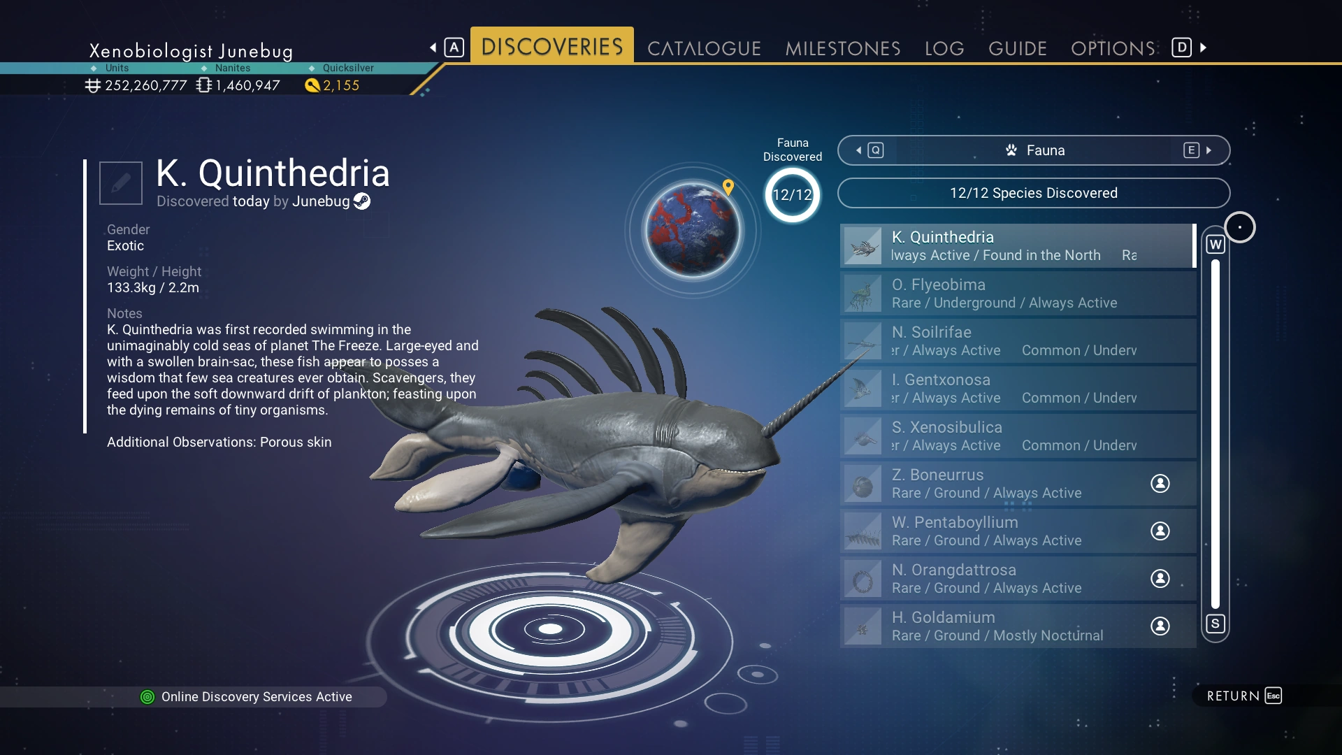 K. Quinthedria was first recorded swimming in the unimaginably cold seas of planet The Freeze. Large-eyed and with a swollen brain-sac, these fish appear to posses [sic] a wisdom that few sea creatures ever obtain. Scavengers, they feed upon the soft downward drift of plankton; feasting upon the dying remains of tiny organisms.