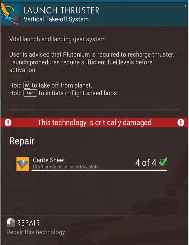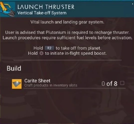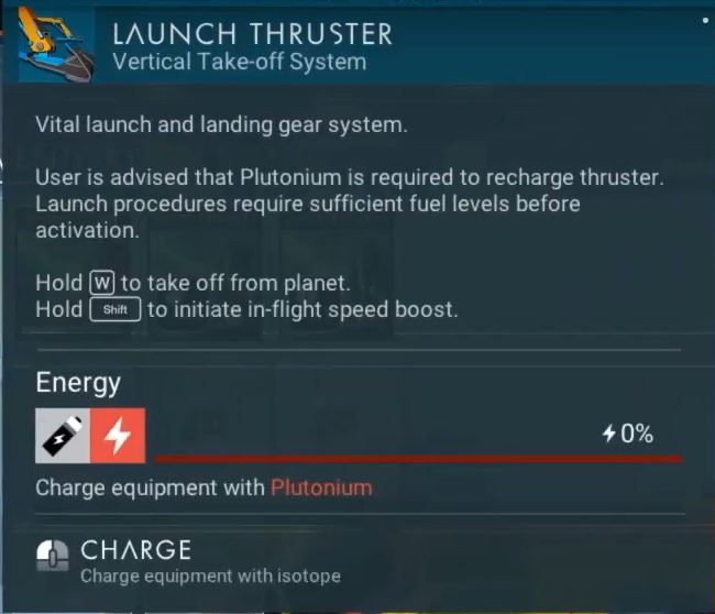 Launch Thrusters consumes fuel each time the starship launched from the surface of a planet or moon, which must eventually be recharged using Uranium (2.5%/unit) or Starship Launch Fuel (100%/unit).