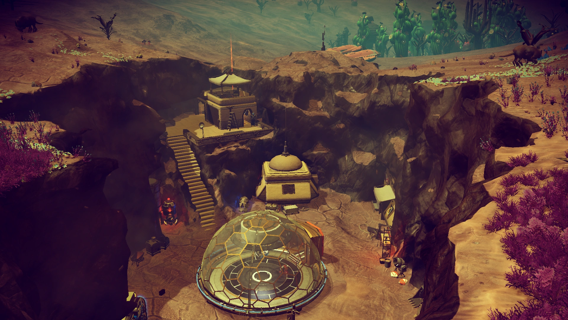 New Roanoke | A man-made cave system, fitted with a trade terminal, the retired Governor's office, a teleporter, a sodium miner, and numerous landing pads on the mesa above. No weapons inside. | -57.47, +66.69 | CodeChimp08NY |