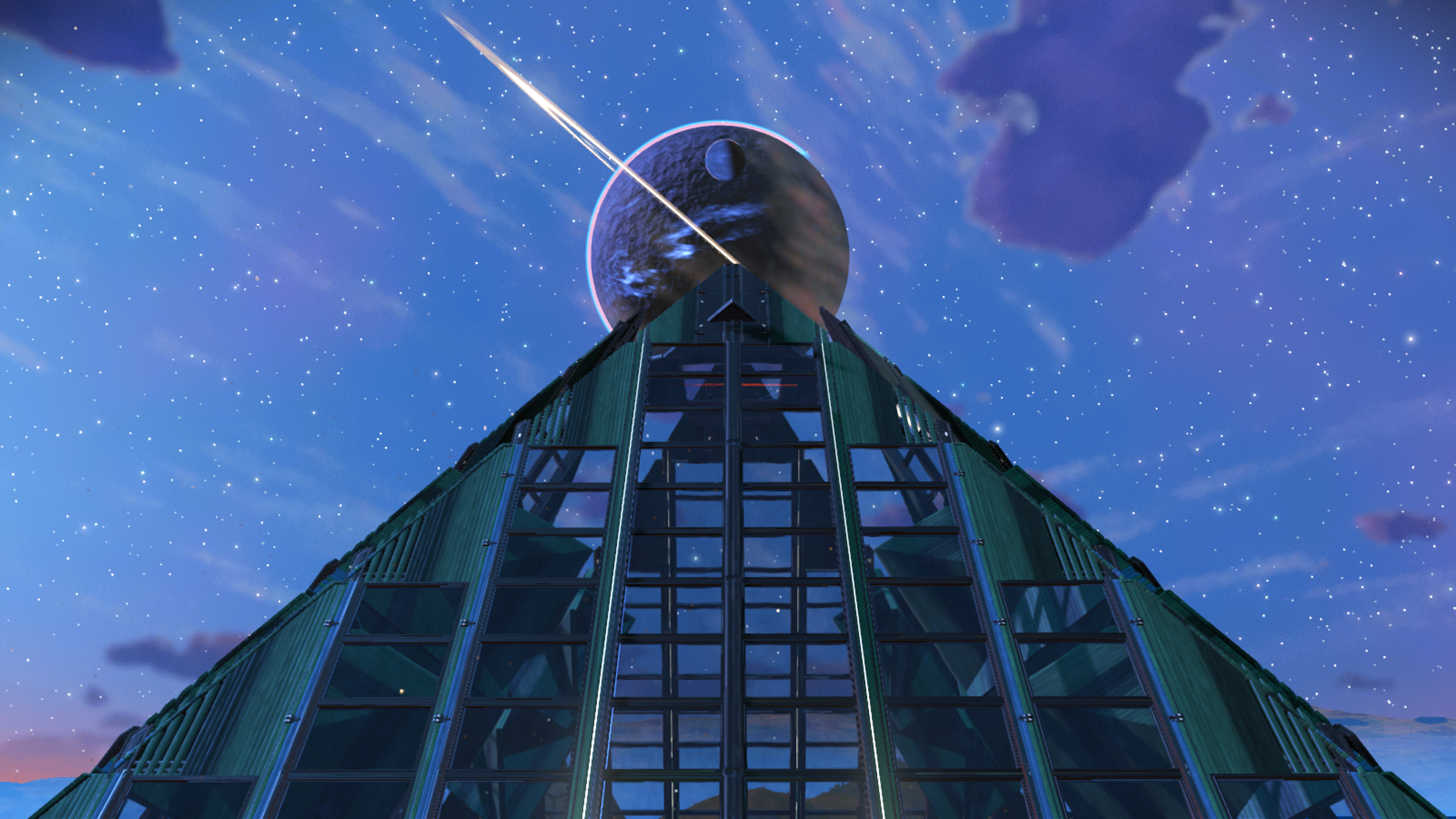 There is an overlook at the top of the building, which has a spectacular view of the neighboring ringed planet Ogawa 47/G3 and its moon Rydon VIII.