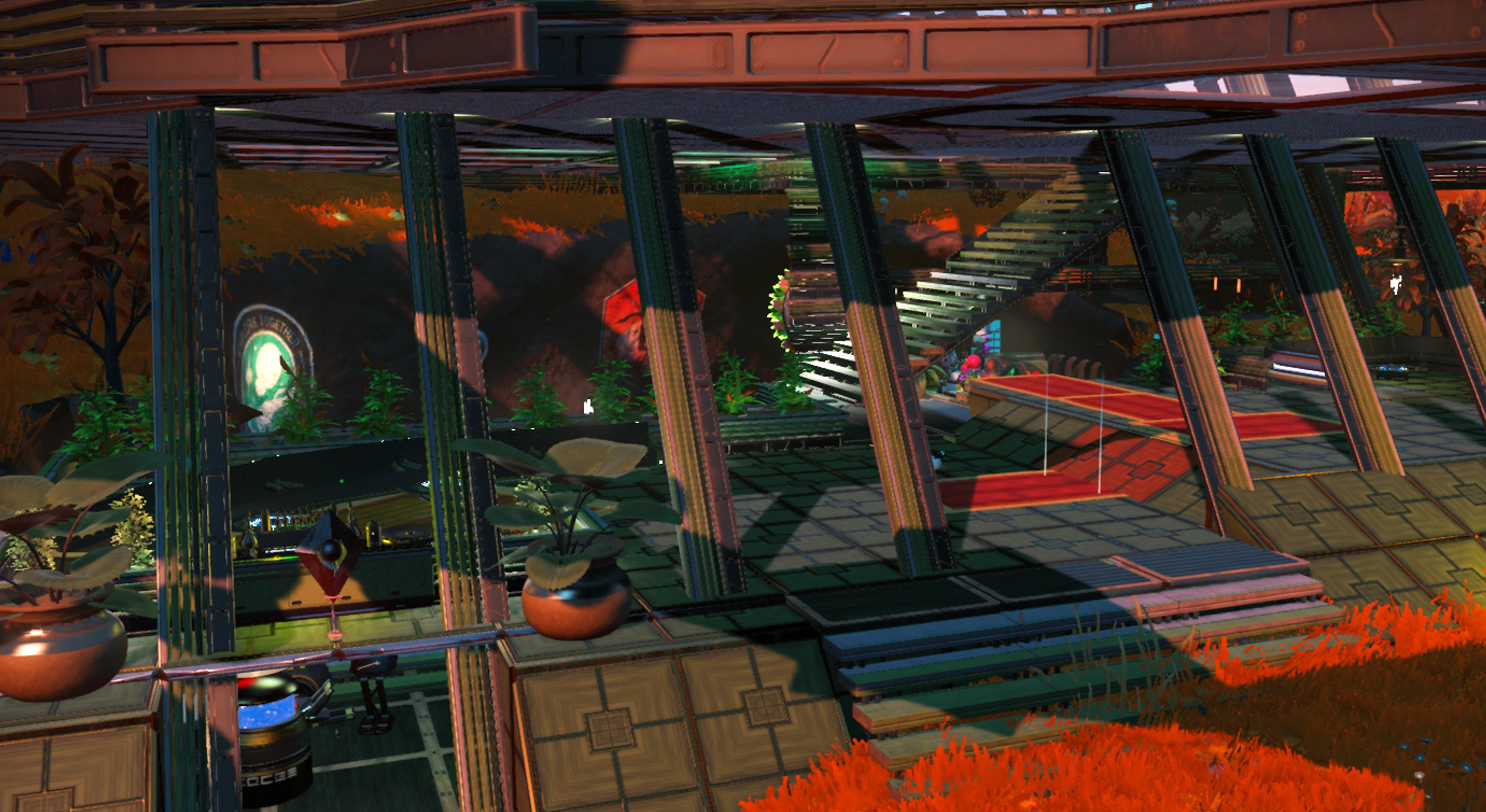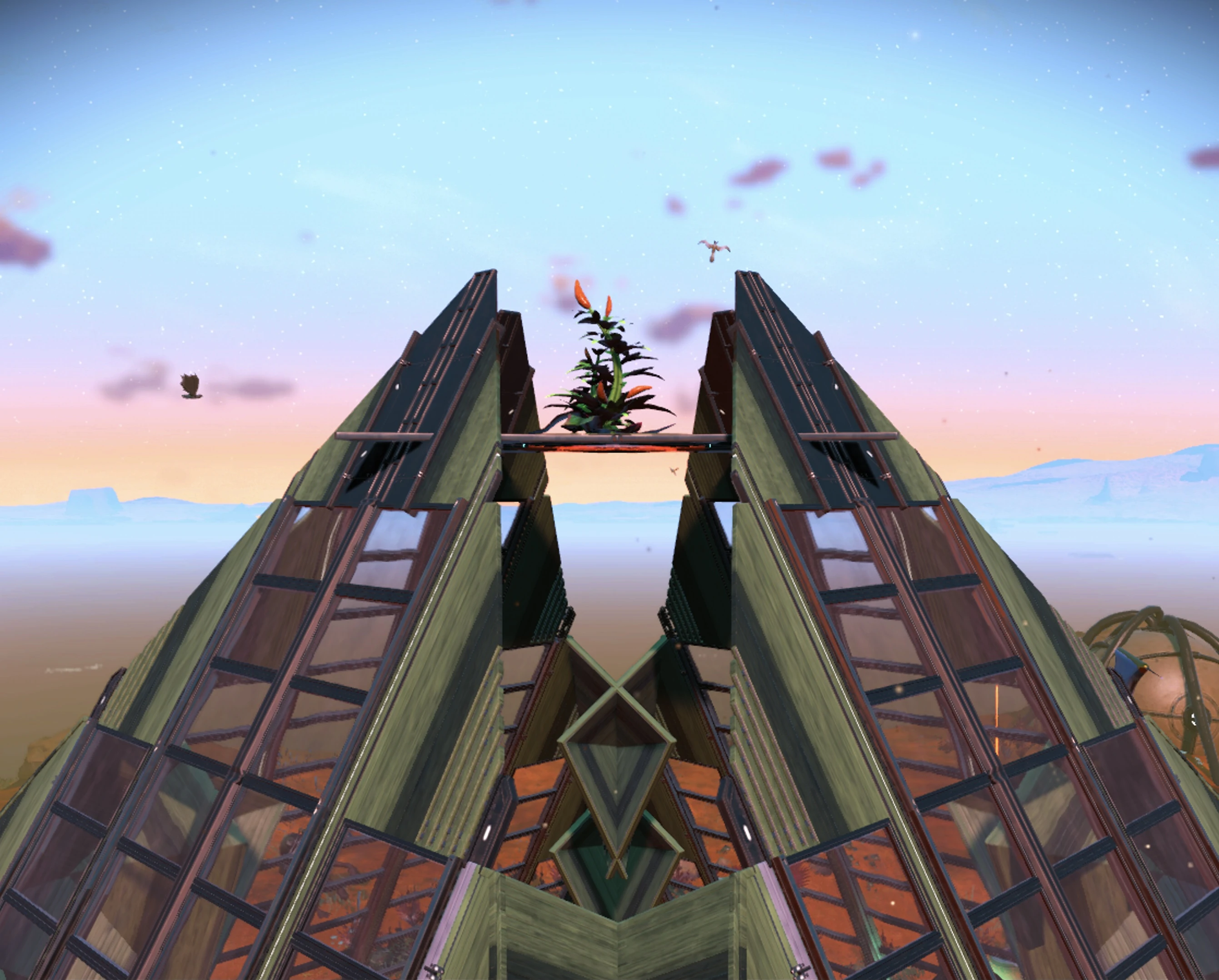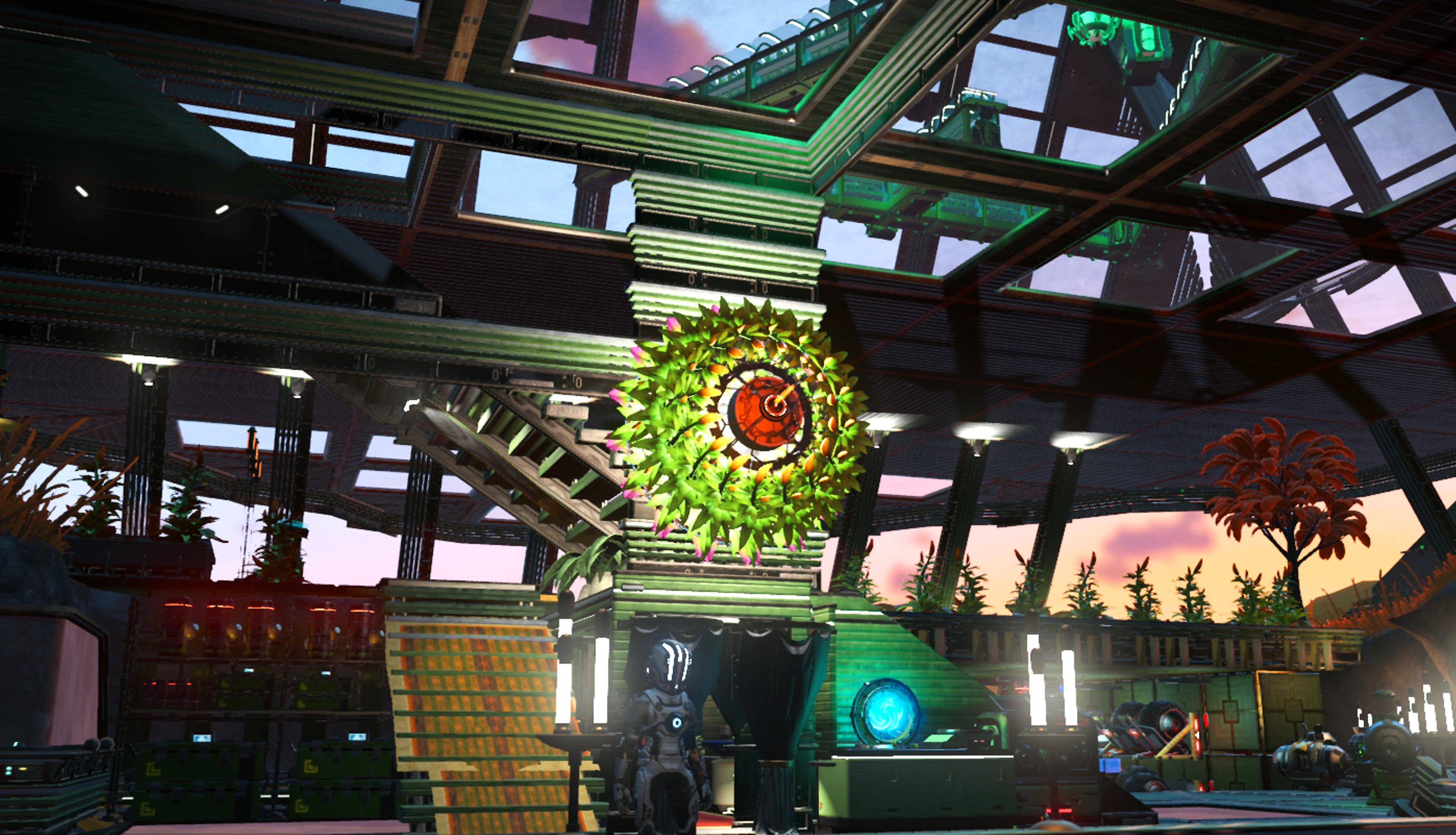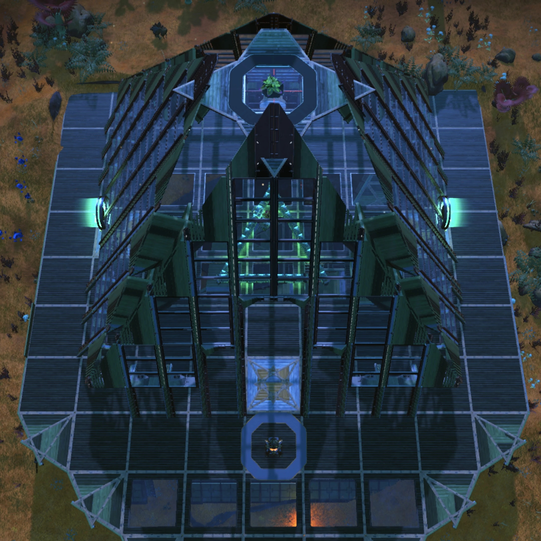 Using green wood to create a 'living building' concept, this pyramid structure hosts Nip Nip plants available for all galactic interlopers. The main floor is a Gek Nip dispensary, managed by our own farmer Gek, Merchant Erb. Underneath this, visiting interlopers will find another level broken up into an interior and exterior areas, including an outdoor lounge and indoor aquaponics research station.