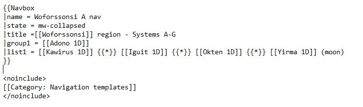 Navigators are a type of macro used in the No Man's Sky wiki, and are stored in the Template namespace. They are NOT visible on mobile devices, so other ways of presenting the information may need to be considered when designing your page.