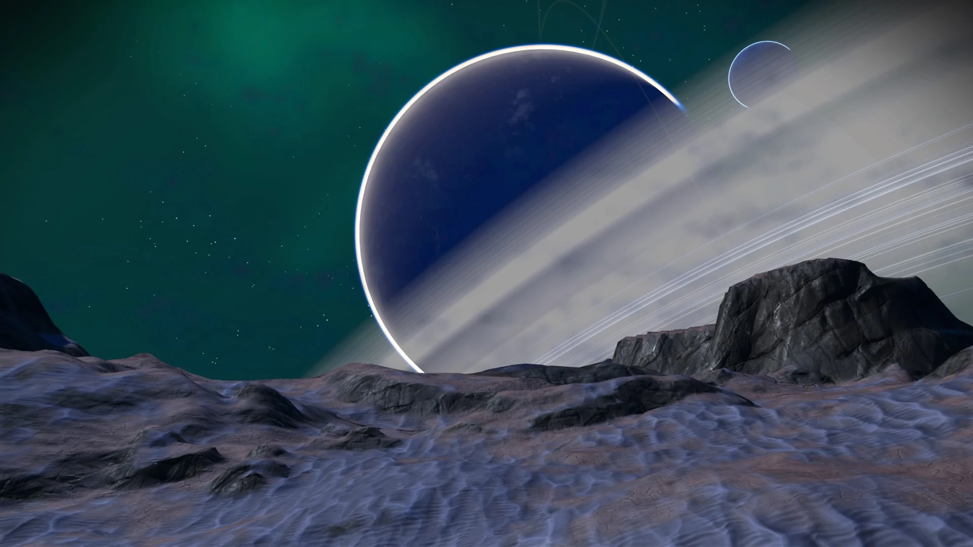 The surface of Omollsegill during the Atlas Rises era, with Edeplance in the background