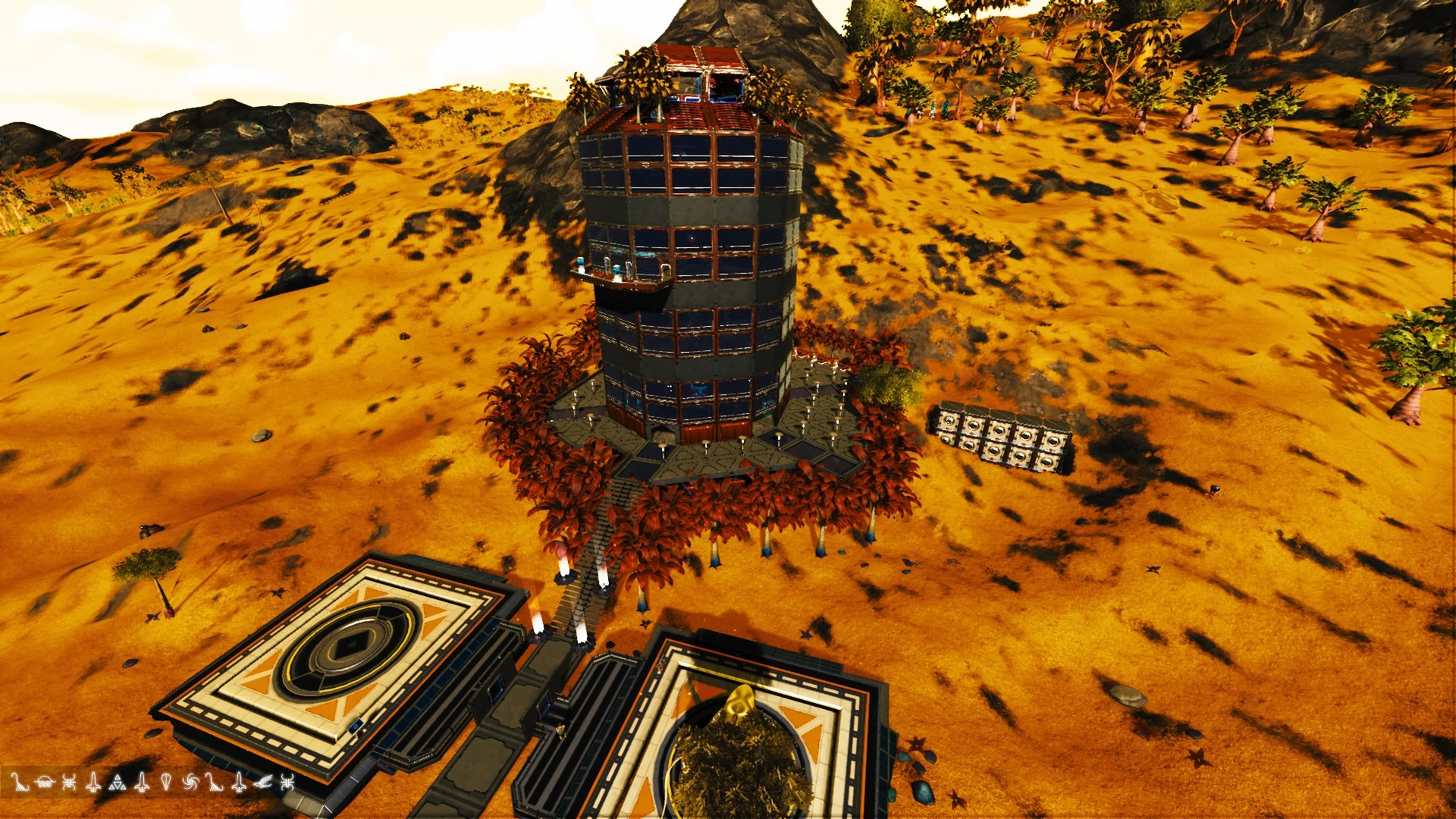 This Base consists of a single four-story circular tower, with two connected landing pads. A rooftop suite can be used when viewing the surrounding landscape.