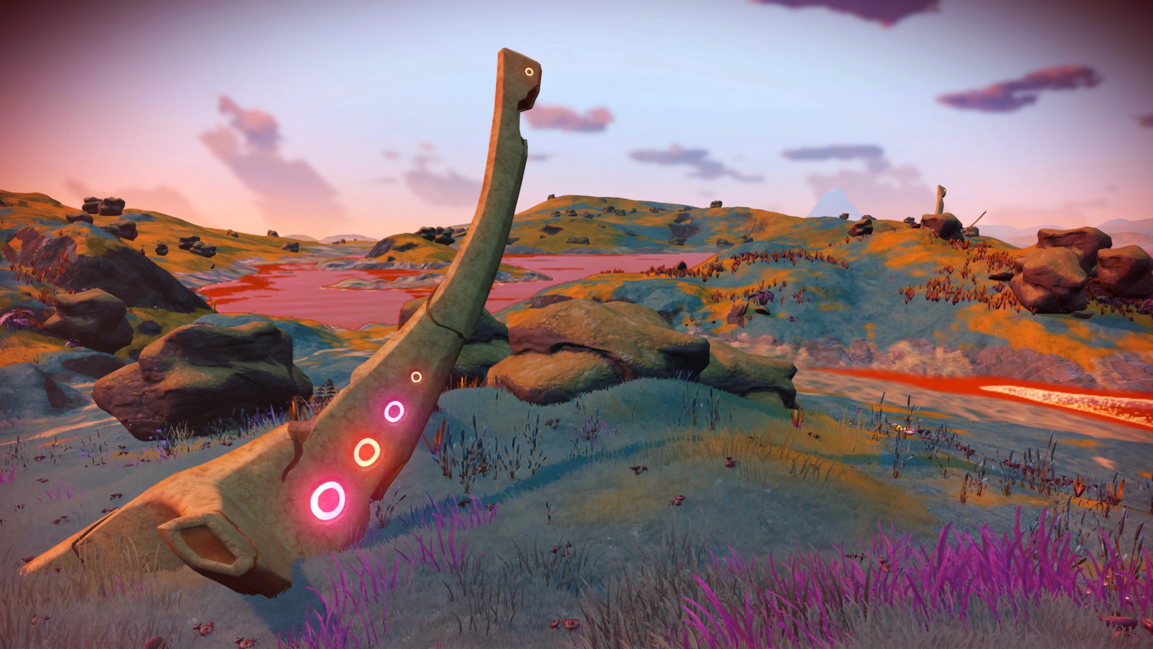 Retur Prime is a Lush paradise covered in yellow and blue grasses and vast golden oceans. Oddly enough, the structures resembling Rattle Spines from Rattling planets dot the landscape.