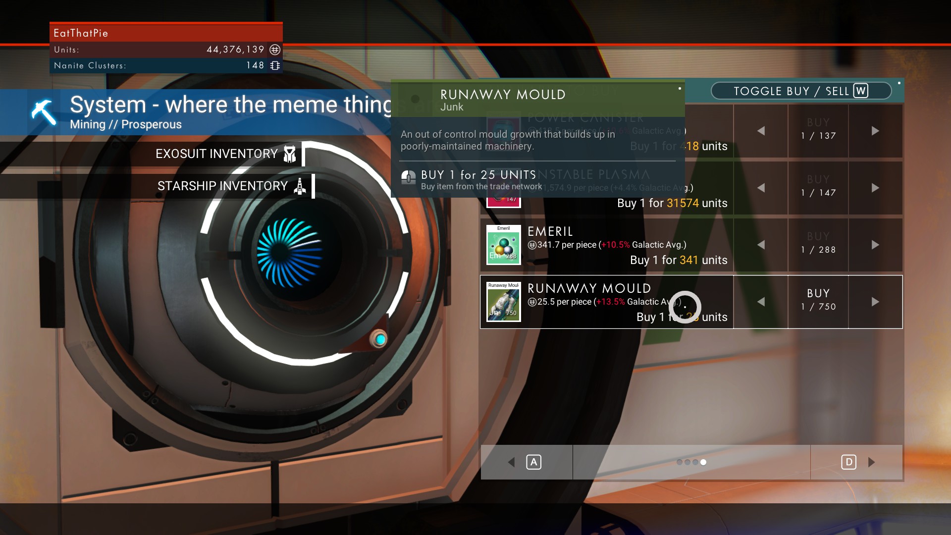 - Runaway Mould can be purchased and sold at Galactic Trade Terminals and NPCs for a profit.