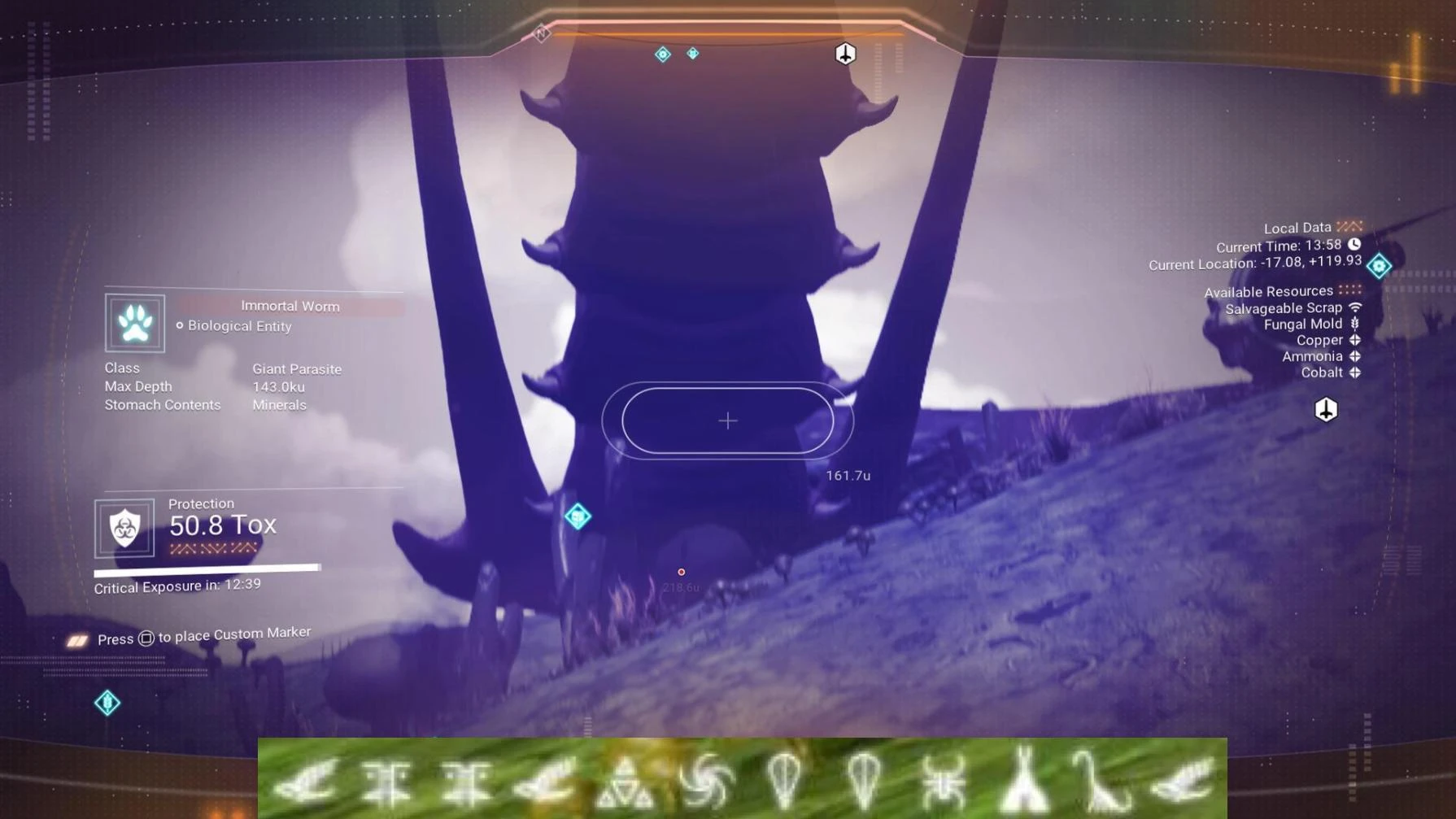 Shaihuluda are unique, worm-like creatures. They are giant and eel-like, and are often seen tunneling or flying at random intervals. They cannot be scanned like other fauna, but some stats will appear while hovering over a Shaihuluda with the analysis visor, where they are all described in common as "Immortal Worm". Whenever they tunnel, a rumbling noise and screen shake can be seen. When shot, they do not seem affected, nor do they attack or run from the player.